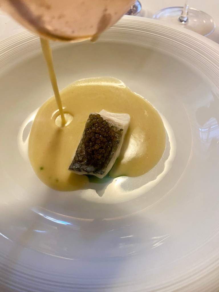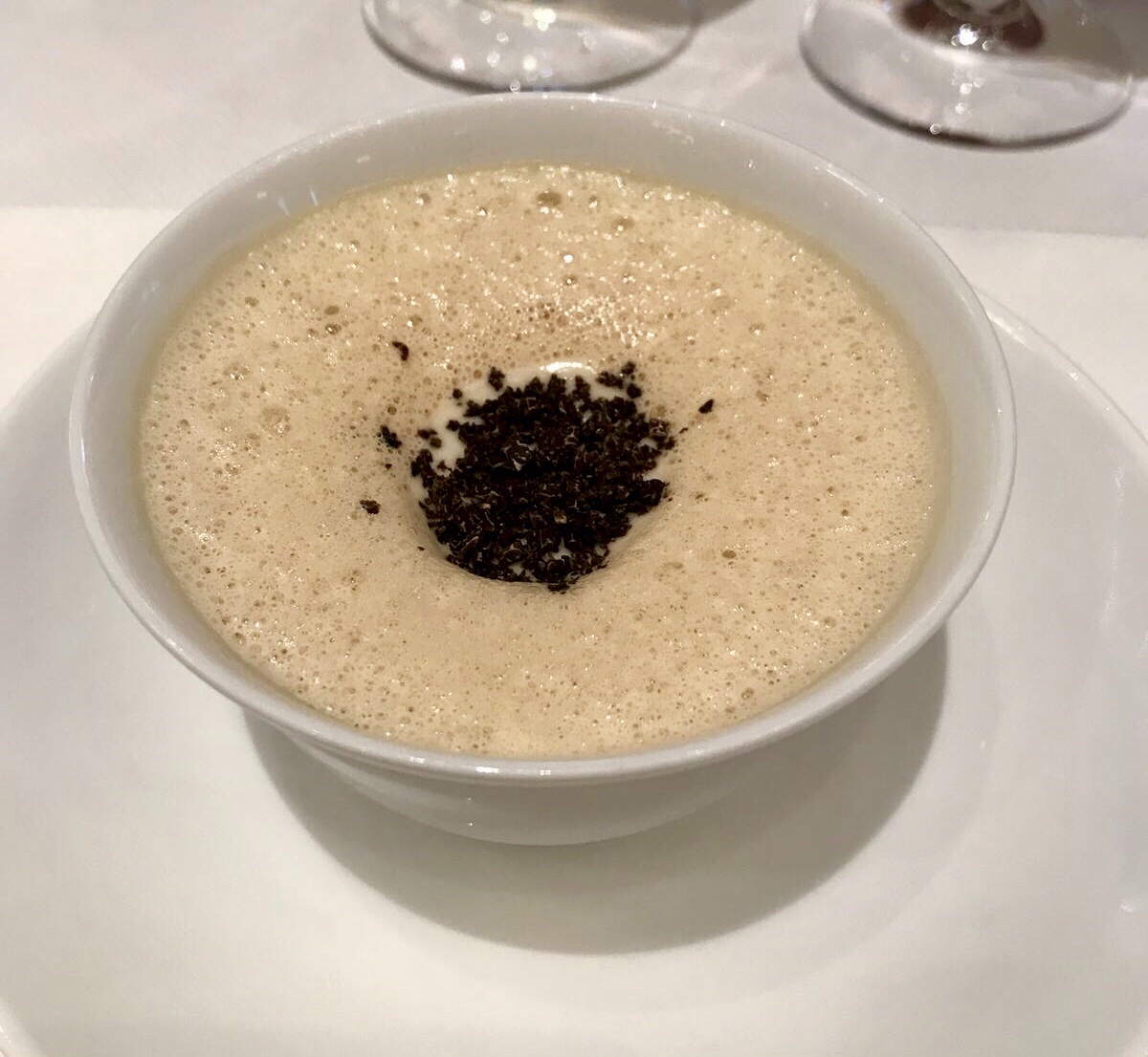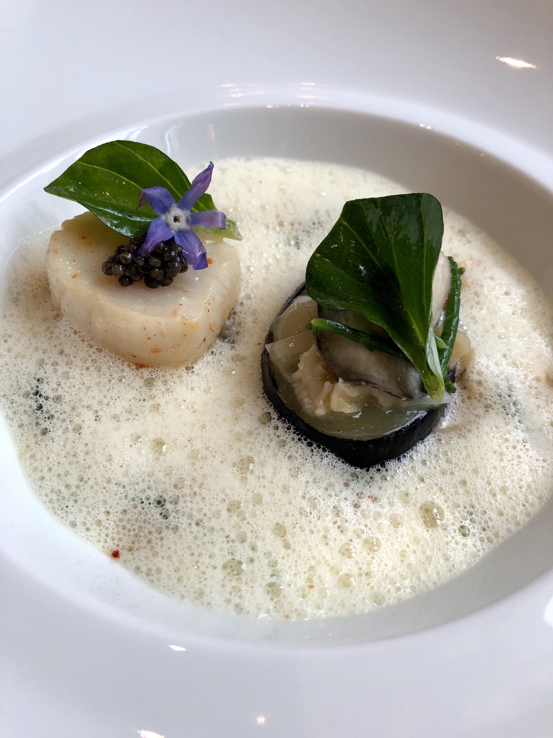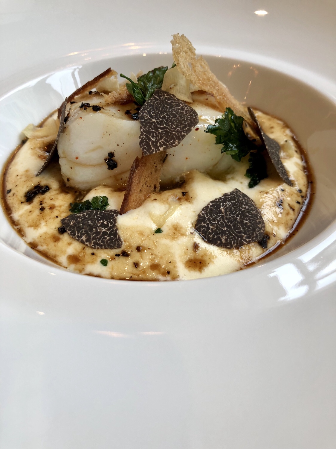 En el plato de vieira está casi da igual frente a una yema curada deliciosa y combinada con trufa negra, praliné de almendras y un estupendo potage, aquí versión ibérica por su arrebatador sabor a jamón.