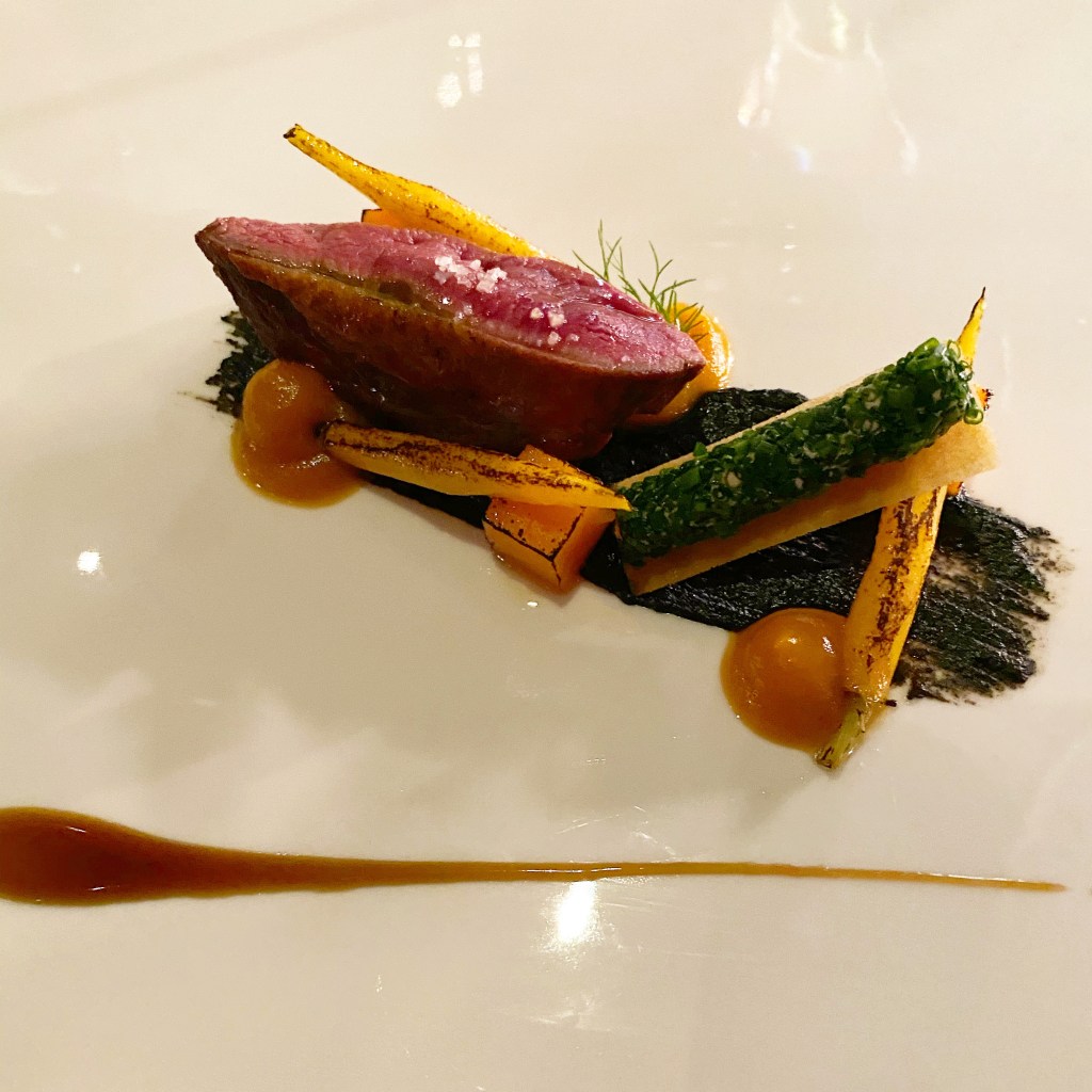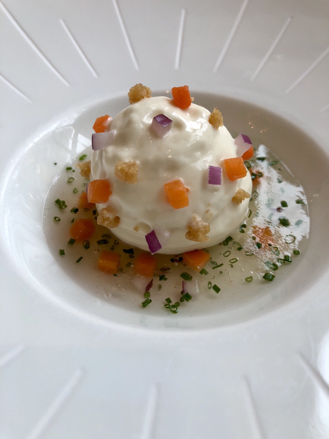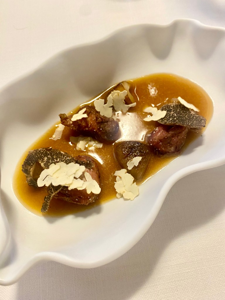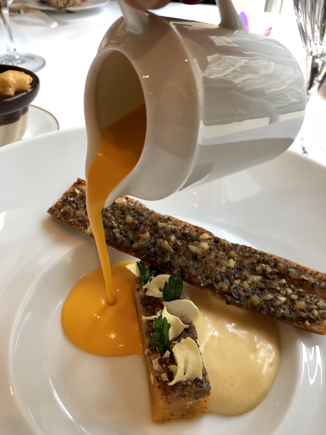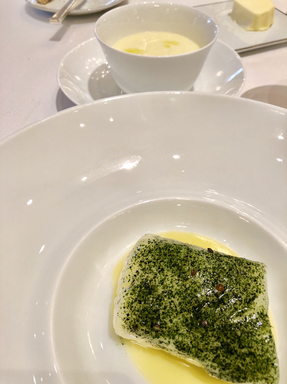 En el plato de vieira está casi da igual frente a una yema curada deliciosa y combinada con trufa negra, praliné de almendras y un estupendo potage, aquí versión ibérica por su arrebatador sabor a jamón.