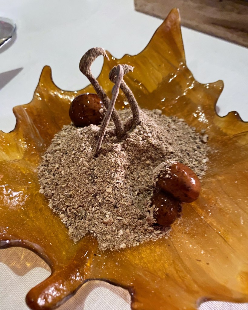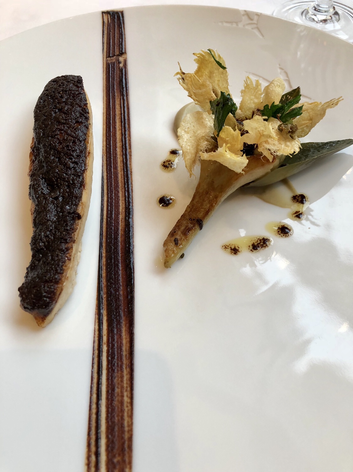 Me encantan las mollejas pero estas superan a todas las que recuerdo porque proceden de de ese cordero sublime, criado en tierras salinas al borde del mar, que es el presalé. Además las prepara a la mantequilla negra, receta que si me gusta con el rodaballo, así me encanta. Dota a las mollejas de mucho sabor y aromas a mantequilla que se endulzan con los de las castañas secas que las recubren.
