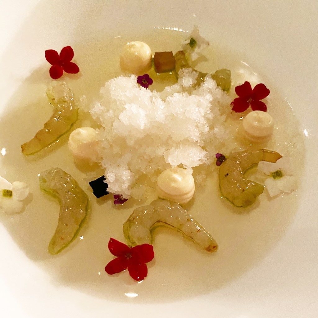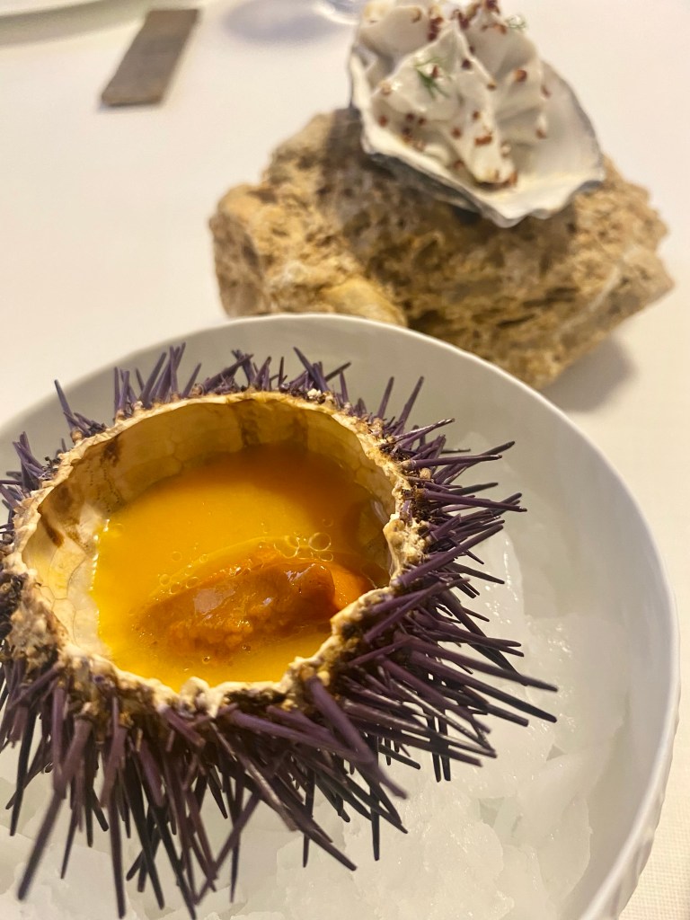 Apenas ha cambiado el menú desde la última vez, pero todo me ha sabido como si fuera la primera, empezando por ese coquillage francés pero también como de playa andaluza: bolo con esponjosa espuma de pimientos, muergo con salsa grenoblesa, berberechos infiltrados de salsa mignonette, ostra de Conil hecha potente y suave espuma y un erizo con un salpicón picante deliciosamente excitante. Y en el plato, otra exquisitez que hace ya difícil pensar con qué quedarse (menos mal que tampoco hay que elegir): gamba blanca con mazamorra de almendra y amontillado, una suerte de delicioso ajoblanco.