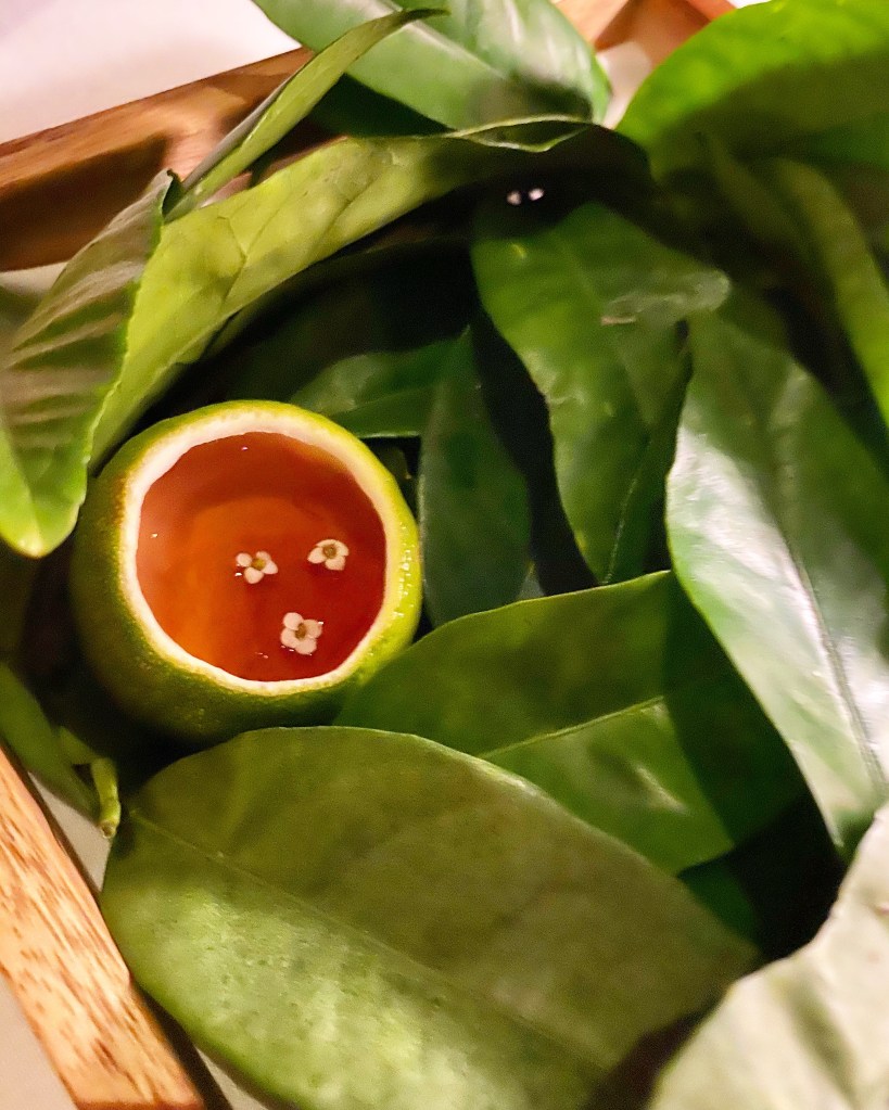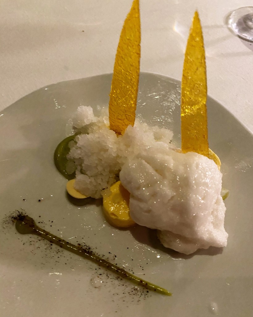 El postre de cítricos rpotentes y yogur con sopa de pepino es el mejor refrescante que se podía esperar después de la intensidad de los últimos platos y está lleno de sabores punzantes y limpiadores.