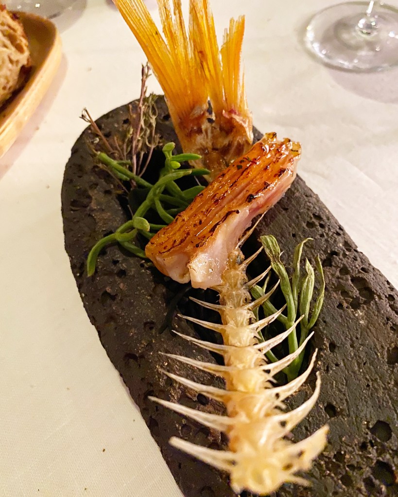 Acaba con aperitivos de tabanco (las tabernas de aquí) y amontillado: chicharrón con emulsión cítrica, crocante y espumoso, sabroso y untuoso paté de la casa, mojama semicurada con queso que es un buñuelo y una remolacha encominá, tan aterciopelada como llena de sabor.