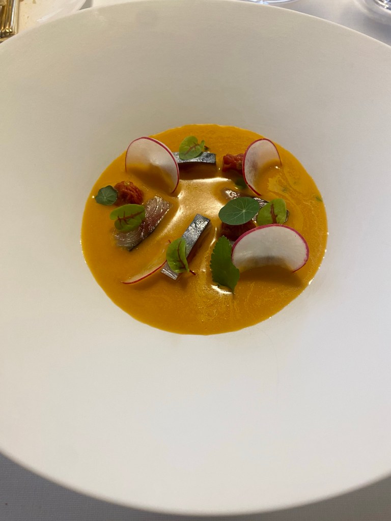 Y el primero de los platos es sopa de pescado o pescado en salsa, da igual, porque es reversible: caballa ahumada en frío con una esplendorosa pipirrana fermentada en botella. Impresionante