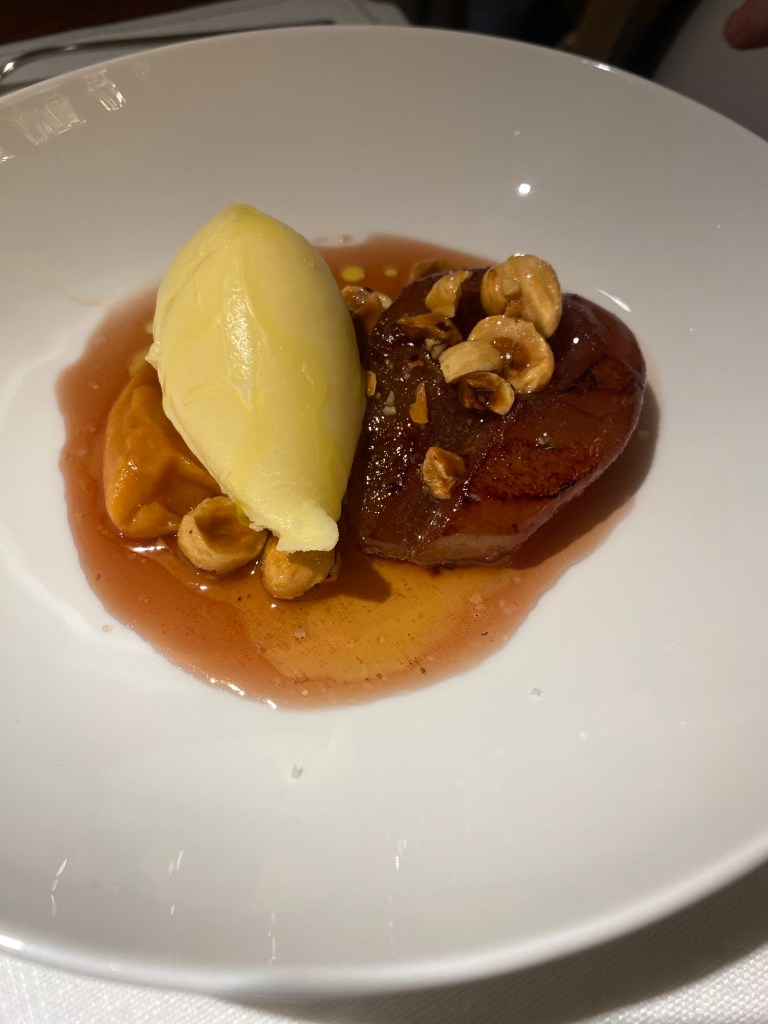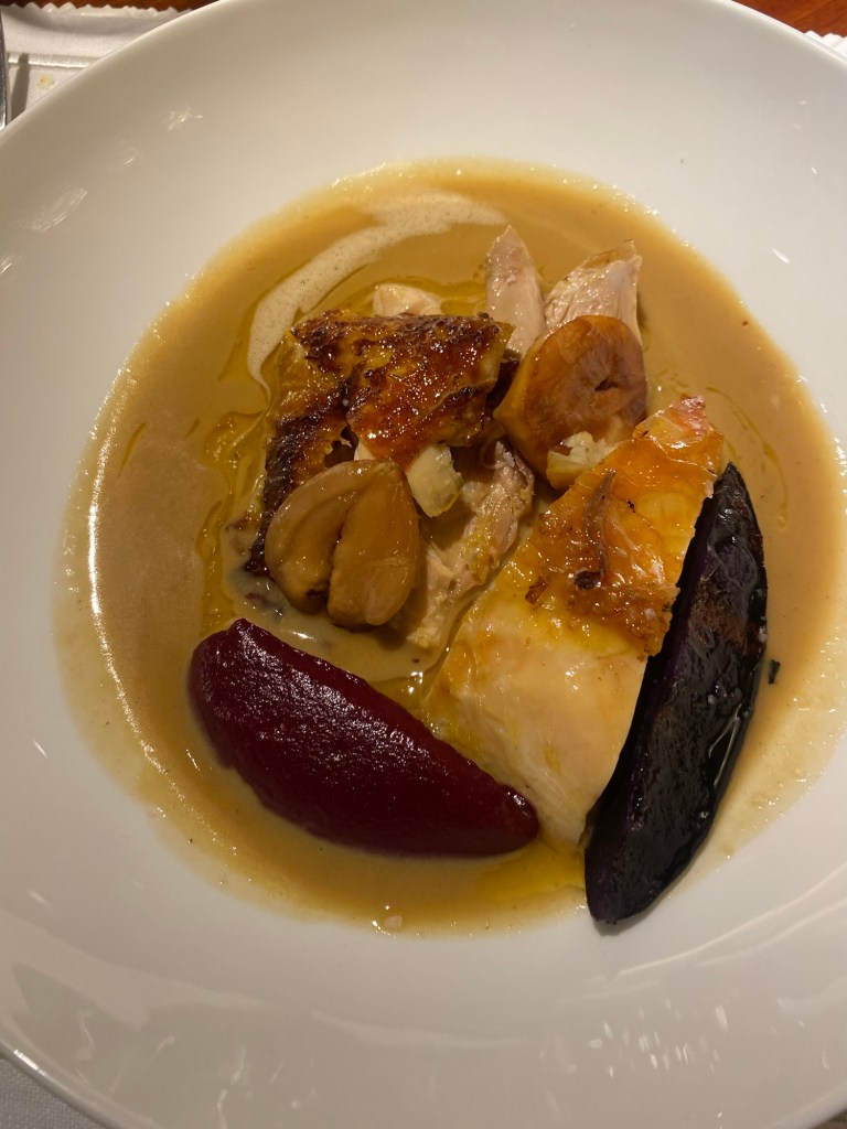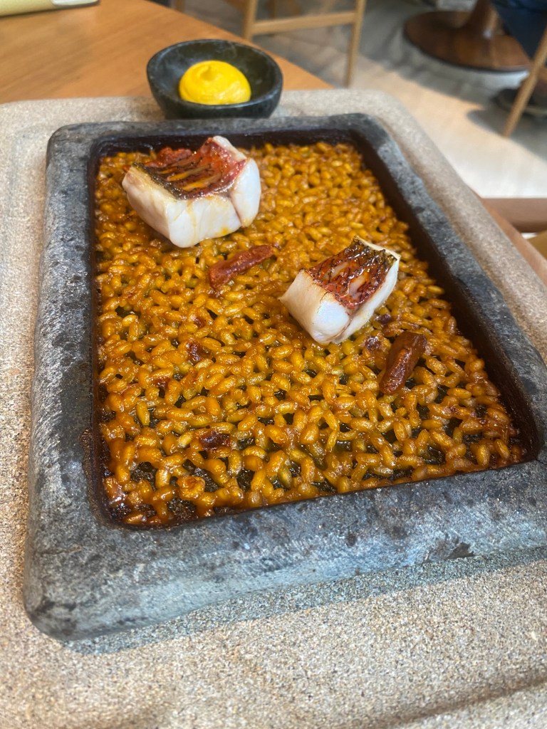 El magnífico carabinero es simplemente a la brasa y la sepieta, tierna y sedosa, a la parrilla con consomé de calamar y unos esparraguiines que son una joya. También un buñuelo de tinta con guiso de oreja muy rico, mas poco ligero.