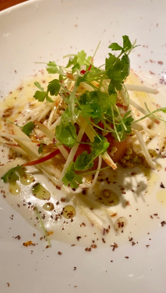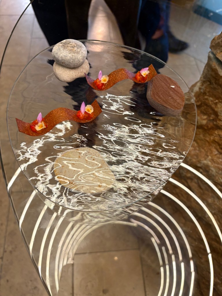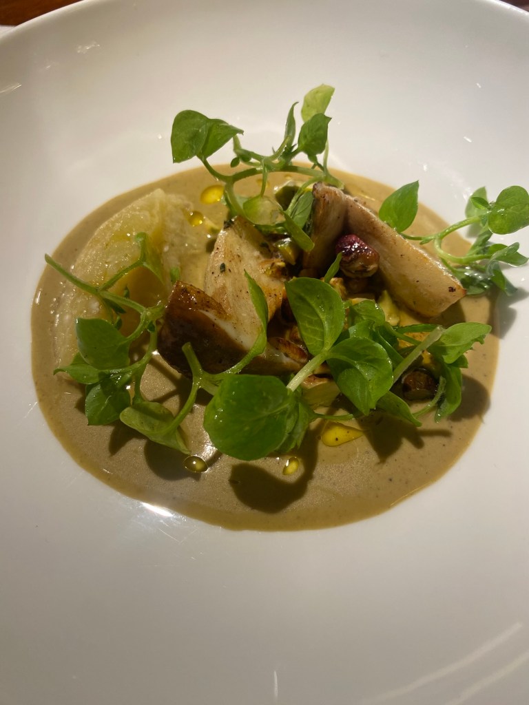Han decidido sabiamente alternar los habituales pescados enteros para dos con grandes piezas que se trocean. Hoy era un maraviloso mero -quizá mi pescado favorito- de Cádiz de 22 kg. A la brasa y con un pilpil de vino, sidra y su colágeno es un verdadero manjar. Con las mini verduras de su finca, el resultado es perfecto.