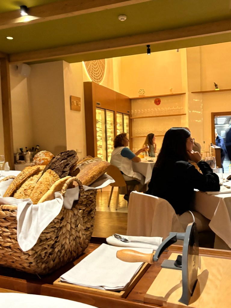 Hay tres menús con tres, cuatro o cinco entrantes, a elegir, de una carta que cambia con el mercado. Y como fijos, un gran pescado, enormes mesas de quesos, postres de un gran carro y un sin fin de pequeños dulces.