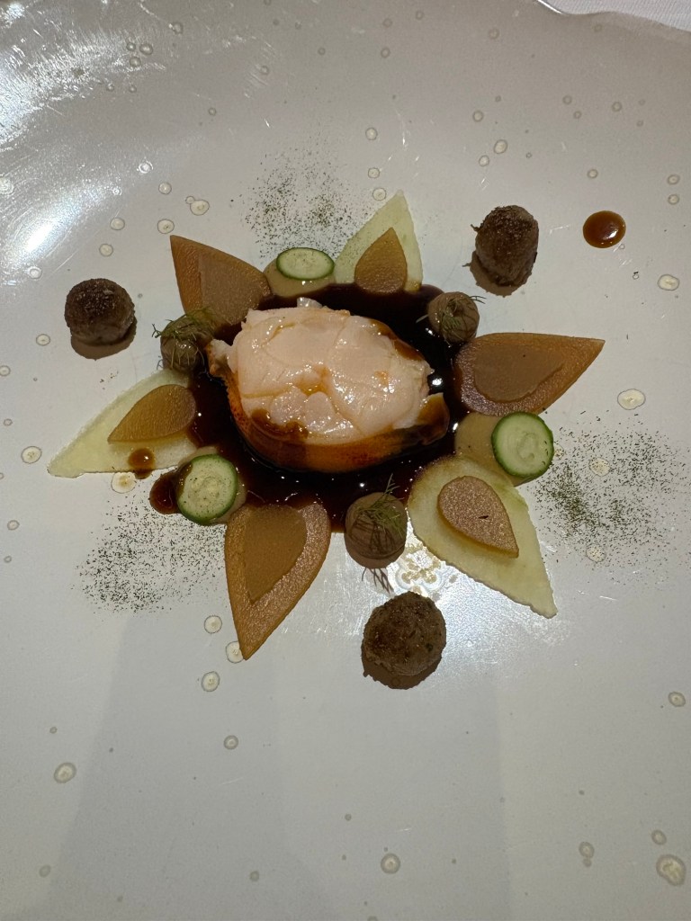 Abel nos ha puesto uno de los platos fuera de carta y que ya aprovecha la primera trufa blanca: un gran consomé con tropezones de gamba realzado por la trufa y con grandes acompañantes: deliciosa parmentier de patata, cremosa y muy mantecosa, y un demasiado denso brioche de caviar.