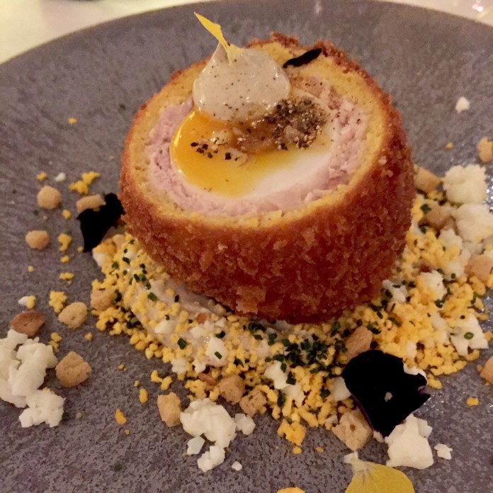 El aperitivo de la casa es una rica alcachofa dentro de un pequeño pudding con bastante densidad, como también el huevo orgánico escocés con mayonesa de trufa, una especie de gran croqueta de patata y jamón rellena de un huevo escalfado y sobre virutas de huevo cocido y mayonesa. Original y lleno de recuerdos a clásicos huevos rellenos. Solo que al revés.