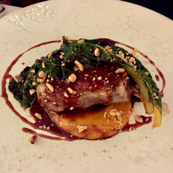 Aún más tradicional y menos arriesgado es el confit de pato con puré de batata y acelgas al carbón, una preparación tradicional a la que se añaden almendras picadas y una correcta salsa de toques frutales que resalta aún más el dulzor de la batata.