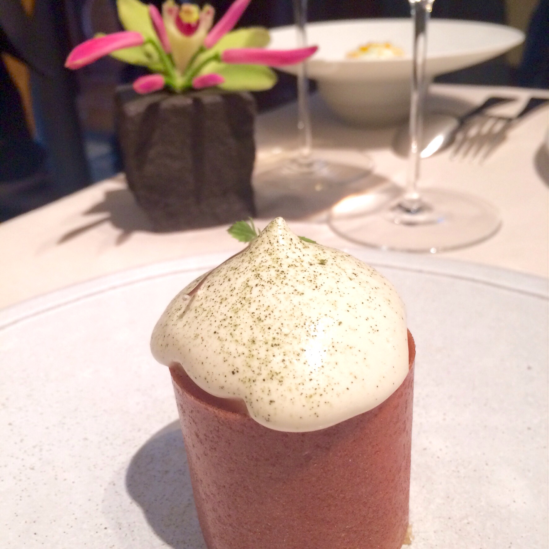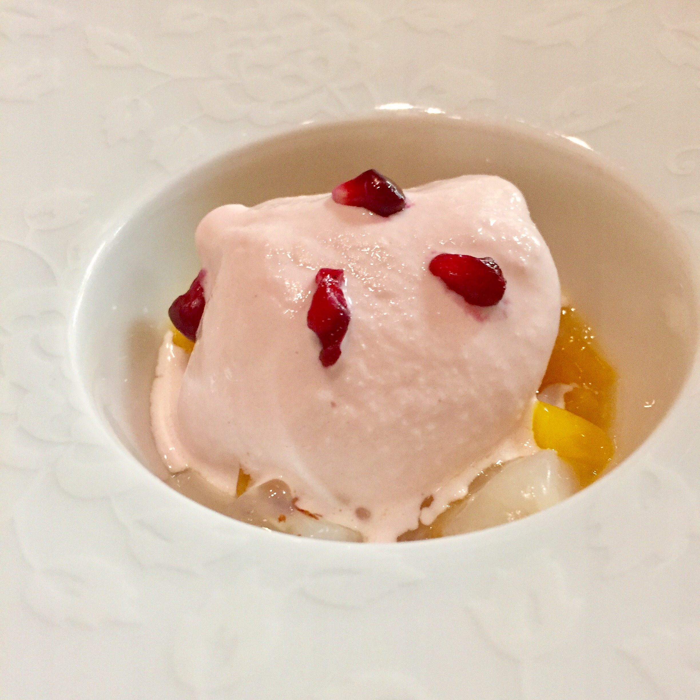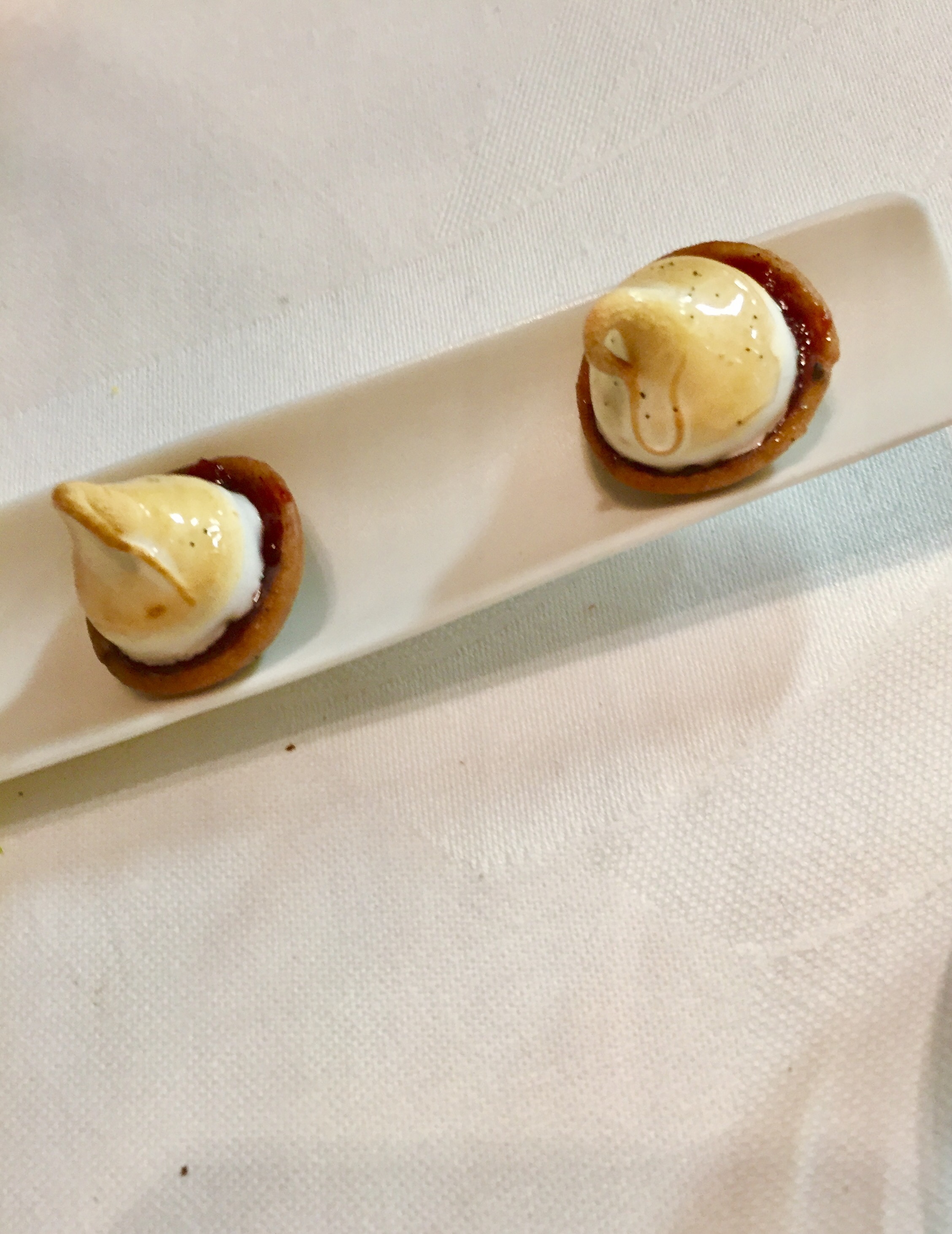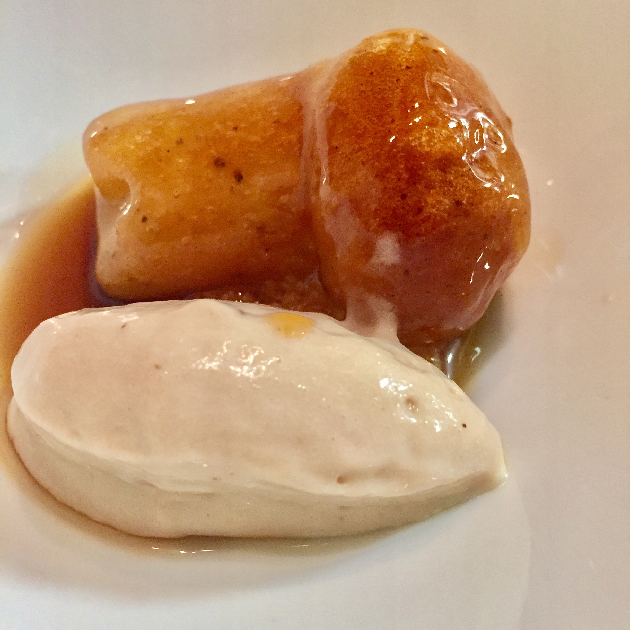 Como no podía ser menos en un francés, muy buenos los postres, aunque solo hay dos. El sherry babá es al Oloroso y se corona con mascarpone y fruta de la pasión. Me gusta más que con ron porque es más suave de alcohol y con mascarpone porque también resulta menos dulce. Una estupenda versión que mantiene la jugosidad y los aromas de este postre histórico.