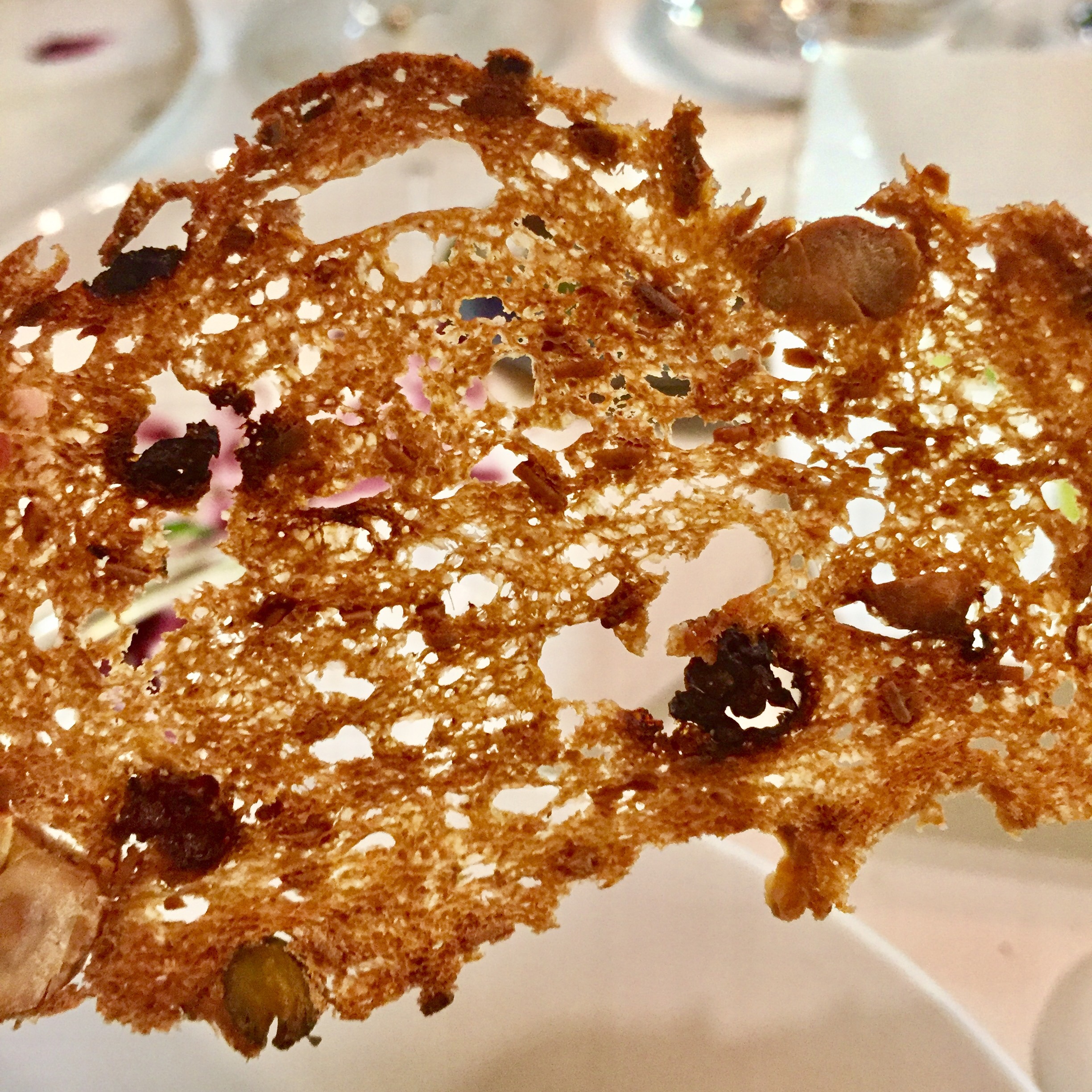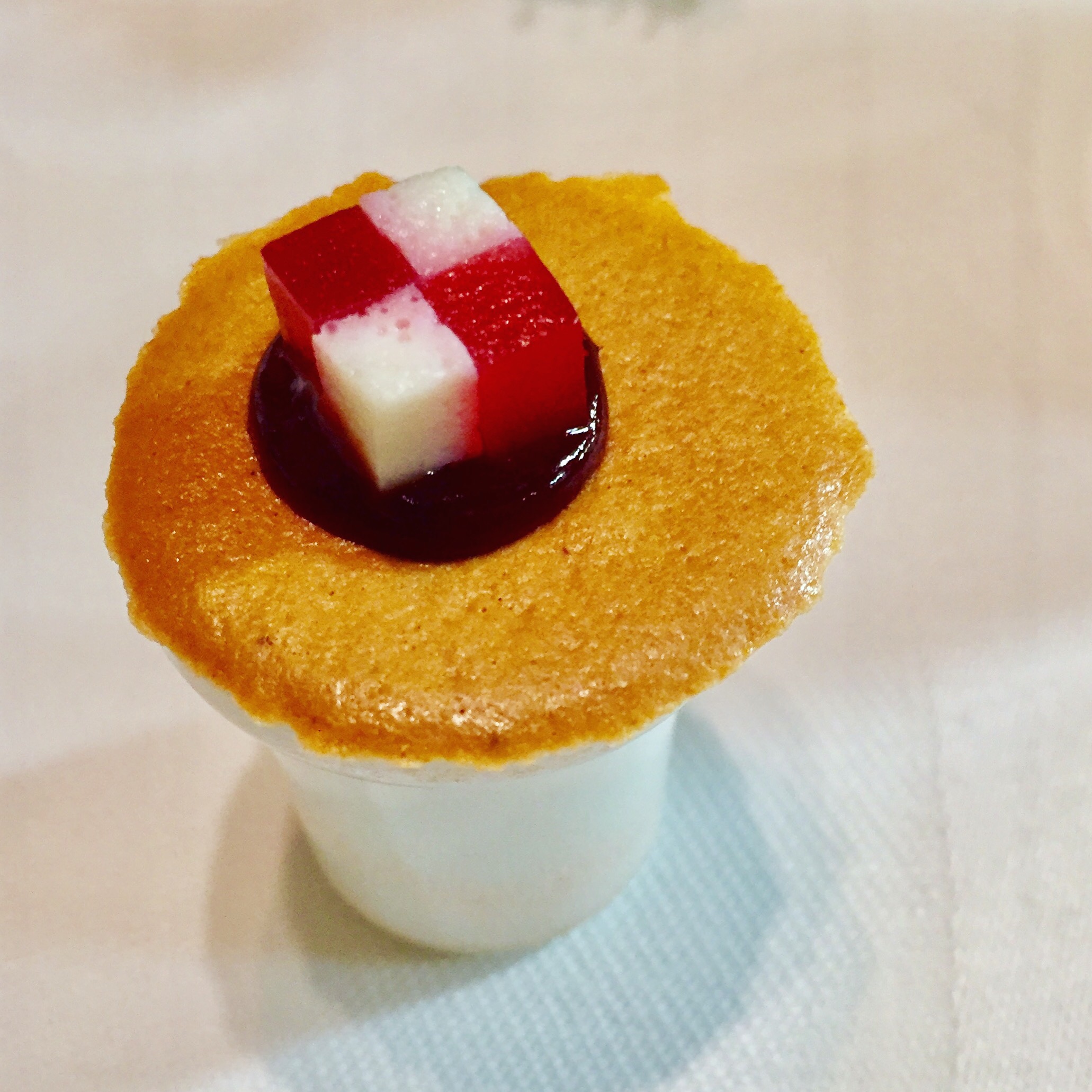 Y acabamos esta primera parte de aperitivos con la espléndida y heterodoxa versión del croque monsieur, sin bechamel y sin jamón. Aquí es un sándwich con otro estupendo pan brioche relleno de un tierno jarrete cocinado veinticuatro horas y sobre el que se coloca un llamado curry francés y un crujiente de queso Cantal. Delicioso.