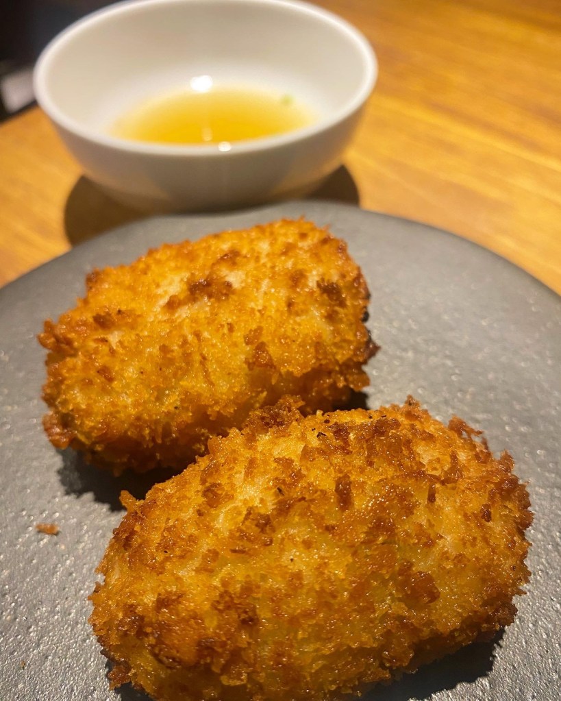La carta es corta y bien pensada, tanto que todo apetece, así que ha sido una comilona, por lo que empiezo ya. Y como no podía ser menos por esas cremosas, crujientes y estupendas croquetas de puchero que se sirven con un espléndido caldo de lo mismo, con bien de yerbabuena. El relleno es más intenso que en las de simple jamón y están llenas de sabor.