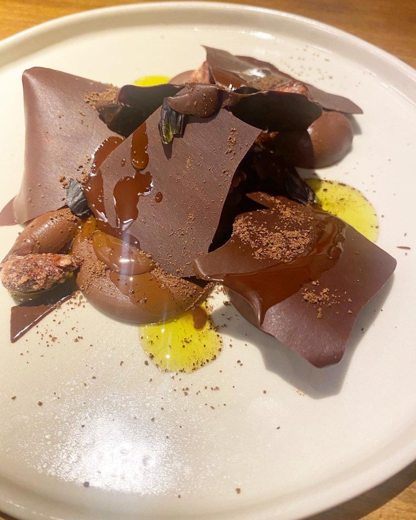 Y acabamos con una mezcla de chocolate negro (en variadas texturas) con la dosis justa de aceite. Está demasiado visto pero también muy bueno y muy adecuado para chocolateros.
