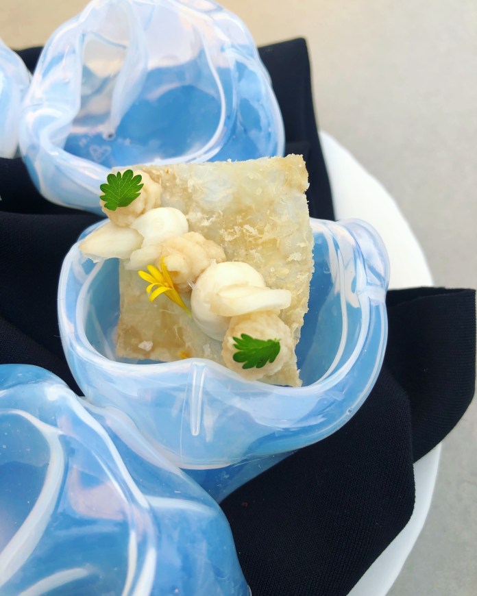 Y para seguir con lo crujiente, una suerte de pan de gambas para acoger un chispeante tartar de cigala en salsa americana con liliáceas y pesto de estragón.