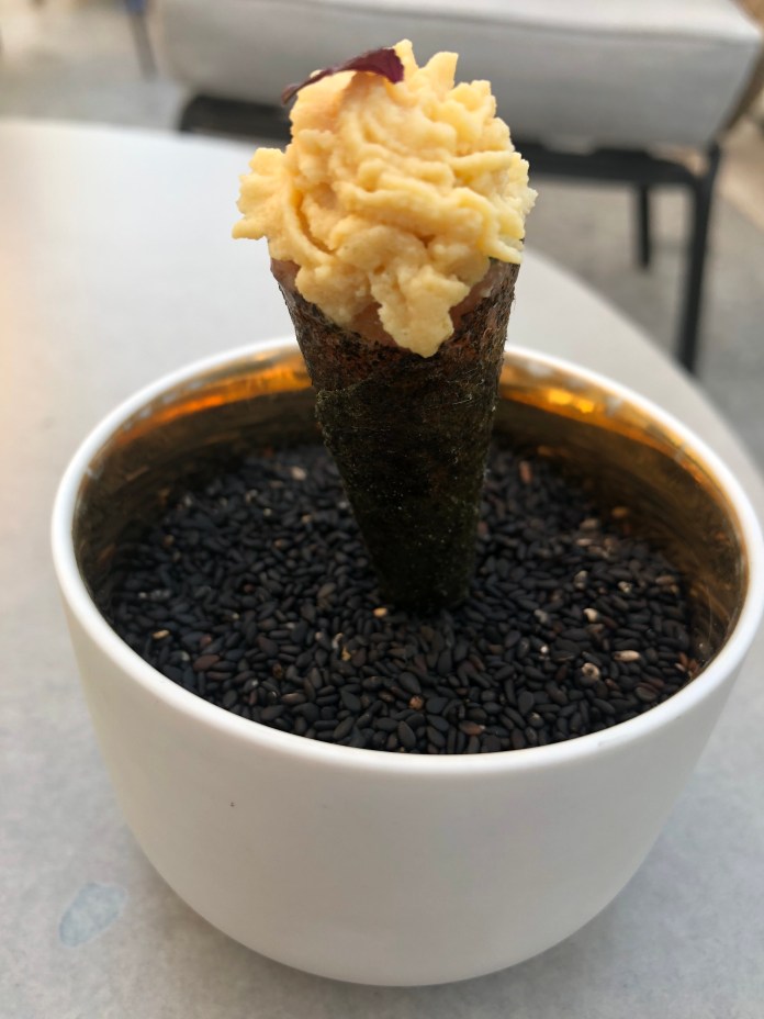 Me gusta mucho el guiño japonés del cornete de salmón y miso, un temaki diferente porque parece un helado de toda la vida, gracias a un cucurucho de alga nori relleno de tartar salmón y rematado con una espumosa crema de miso.