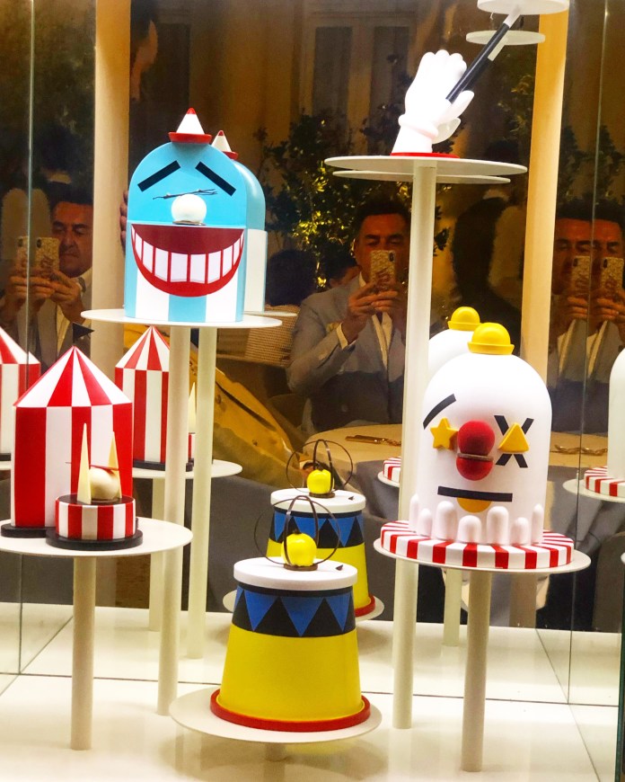 Pero el verdadero espectáculo llega con el Circus Cake, en enorme armario circense que al abrirse descubre una gran variedad de tartas montadas sobre bellos soportes de manos enguantadas, cabezas payasescas sonrientes y hasta la carpa de un circo.