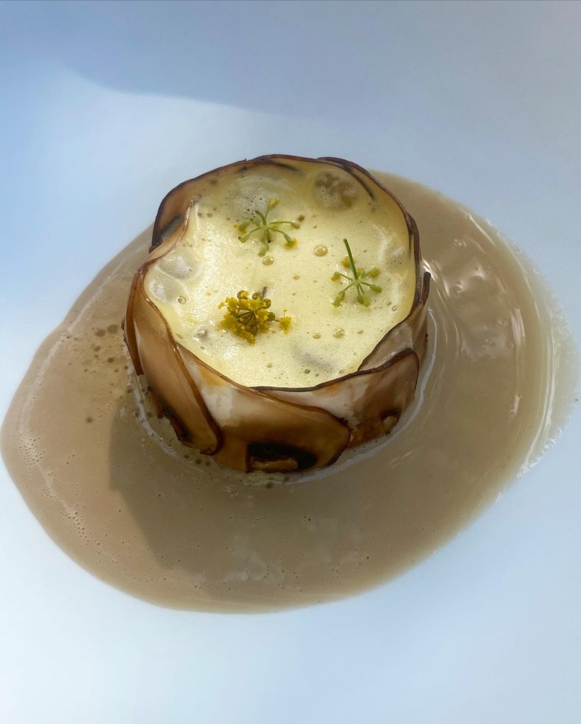 Después, un fresco tomate de su huerta regado con agua de río y ahumado, cubierto de una crema láctea de cabra, además de verdes brotes ácidos, aceite matcha y nata fermentada, da paso a un gran plato de setas de monte, trompetas, angula de monte y níscalos con una espumosa pamnetier de patata y crema de yema. Todo ello envuelto en el delicioso y boscoso sabor del praline de piñones.
