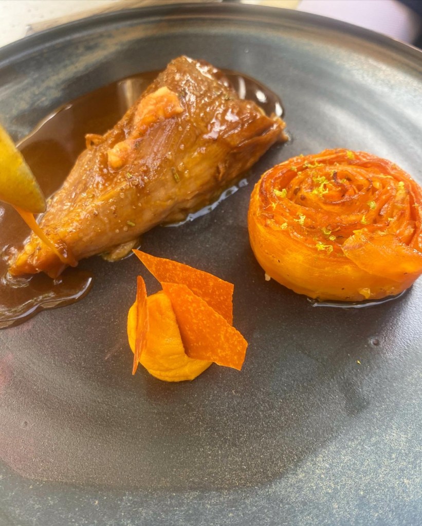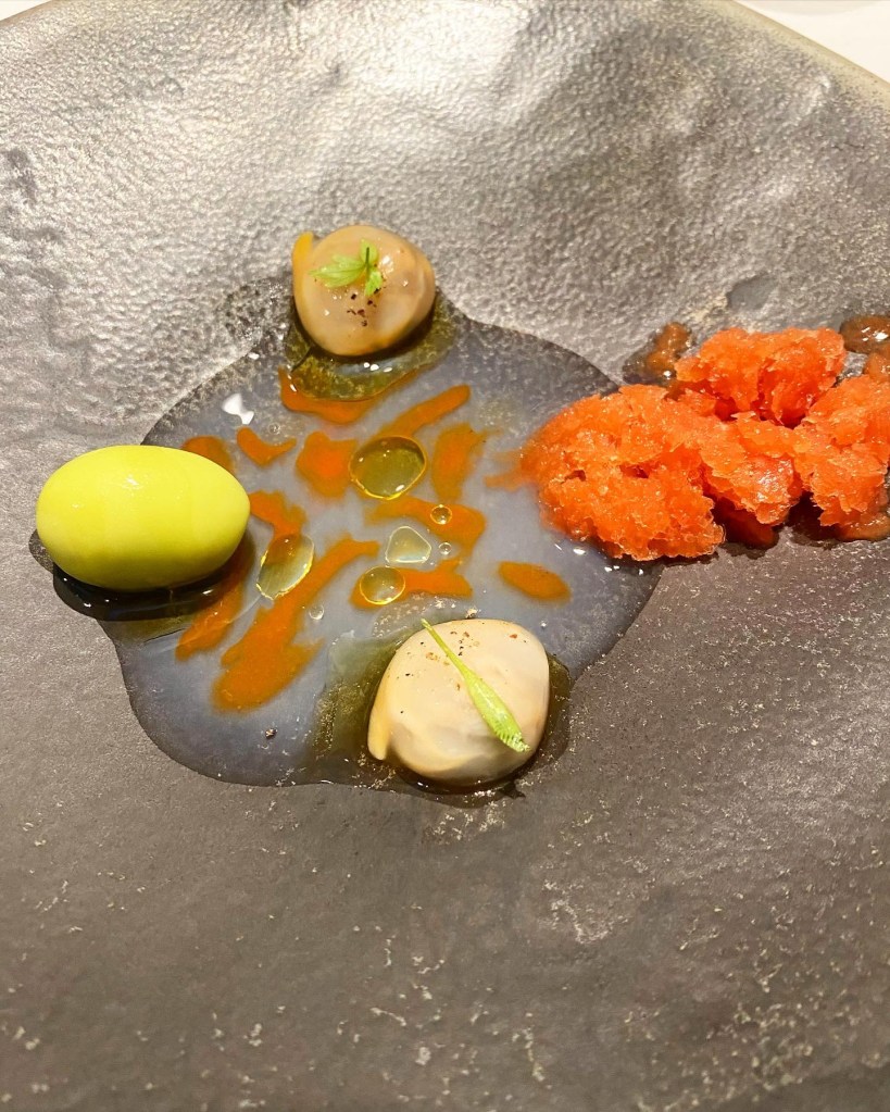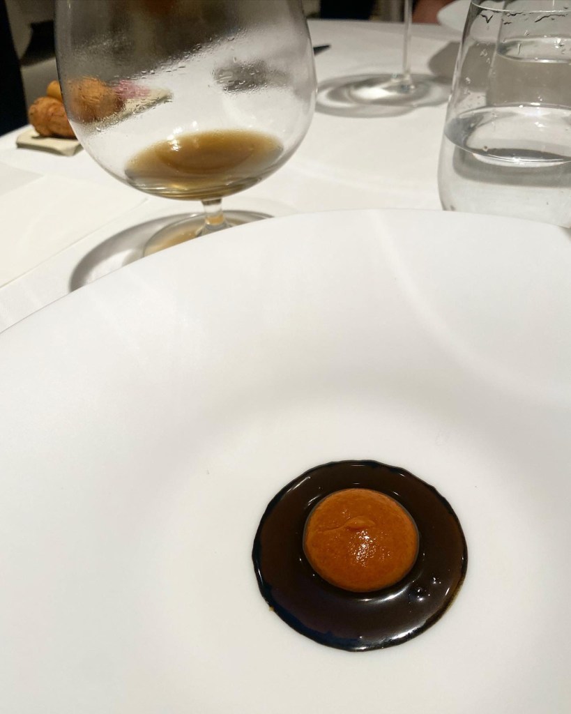 Pero es mejor que vean todo esto a través de su cocina, empezando por cuatro grandes aperitivos: una nada marina -pero dulce y deliciosa-, y muy crujiente tartaleta de calabaza y naranja (helada) acompañada de un sutil pisco sour de calabaza y naranja (2022); un muy marino y sabroso sándwich de melba (que es también potente crujiente de alga nori), con punzante mayonesa de wasabi (2017) y un soberbio “recuerdo de Galicia” (2018), un mosaico de estofado de pulpo con patata y pimentón. Como un pulpo a la gallega, pero en mejor aún.