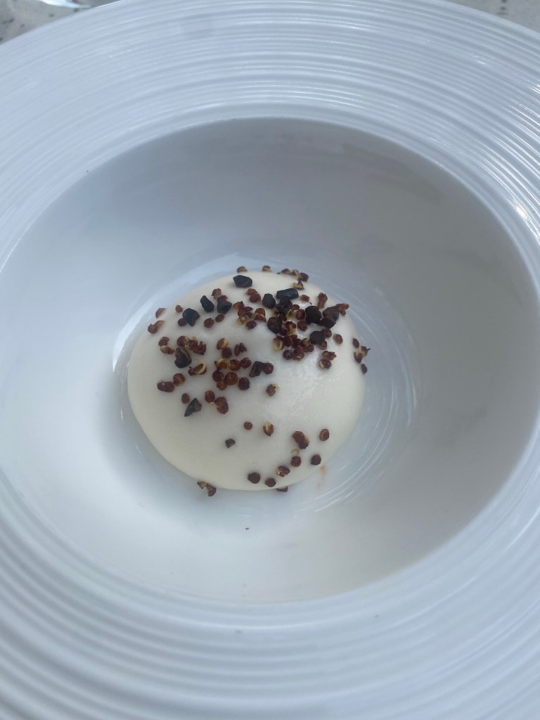 Los postres son estupendos como es norma en Francia: como aperitivo una suave crema de vainilla con quinoa frita y pimienta roja.