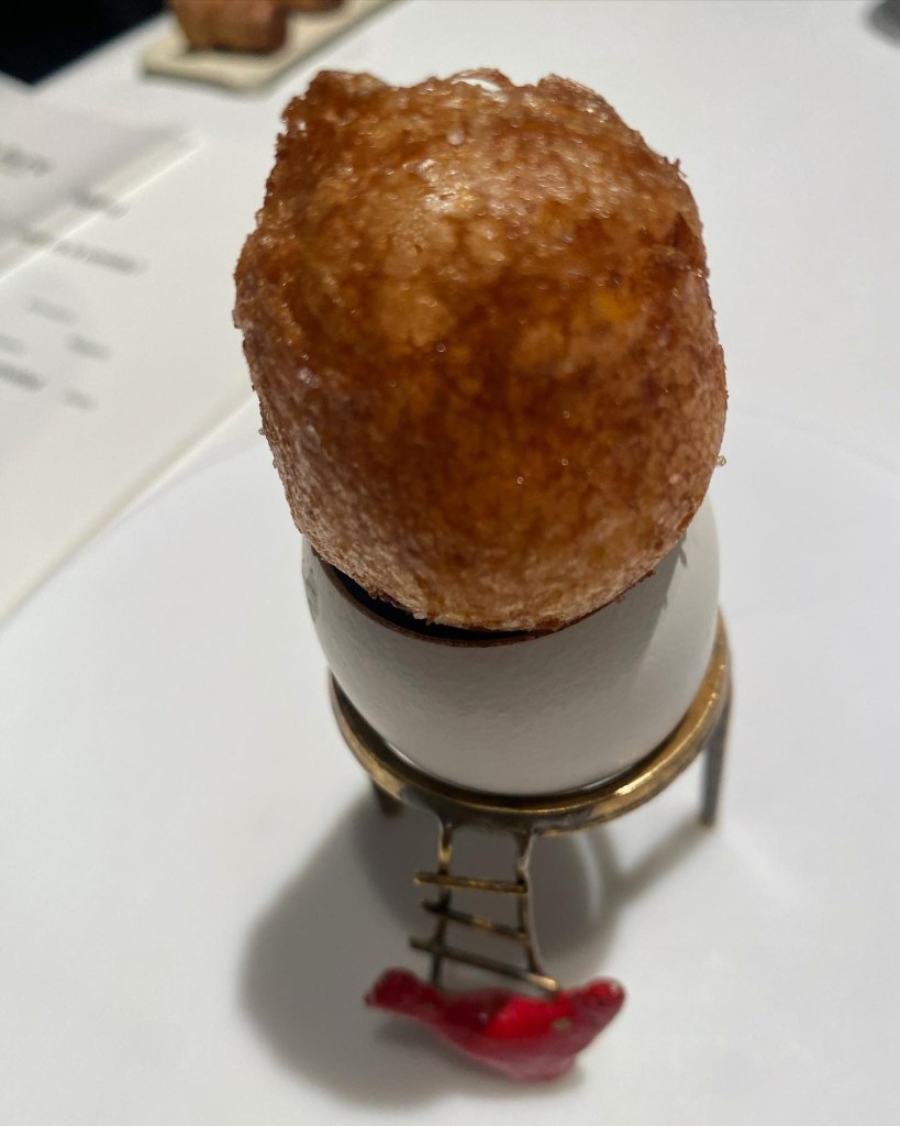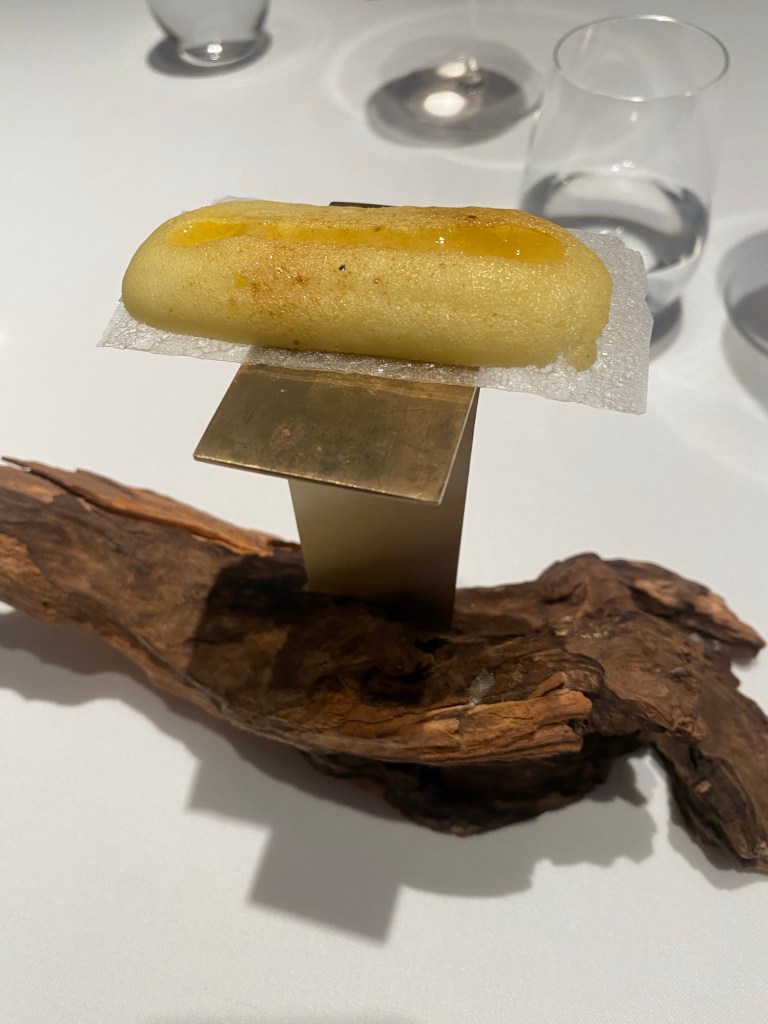 Ya desde los aperitivos despunta la alta cocina, todo lo que el chef dos estrellas, que ya merece tres, ha aprendido en tantos años de esfuerzo, creatividad y zarandeo de la cocina portuguesa: un cacahuete mimético que es una explosión de salsa satay, crujientes de escabeche de setas o alubias y aguacatecon leche de tigre, empanadilla de berenjenas y pimentón (que me gustaría que supiera más a berenjena) y un sorprendente huevo de oro relleno de humus líquido. Sabor y belleza.