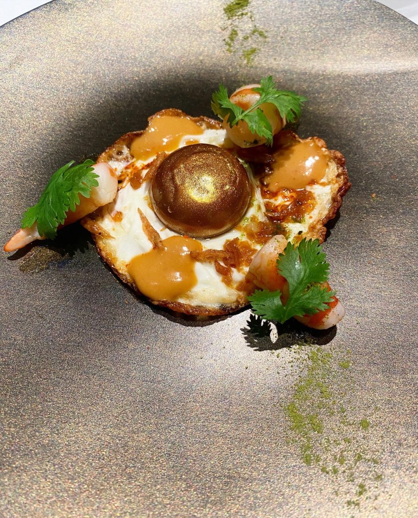 Tanta sencillez no podía durar y a continuación, abruma otro de los clásicos como es la gallina de los huevos de oro, un huevo frito con langostinos, cuya falsa y perfecta yema es un chilly crabcon salsa de carabineros en esferificación, salsa Tai e itotogarashi. El plato es impresionantemente bueno sin más consideraciones, pero si se añade toda la parafernalia contada, resulta absolutamente inolvidable.
