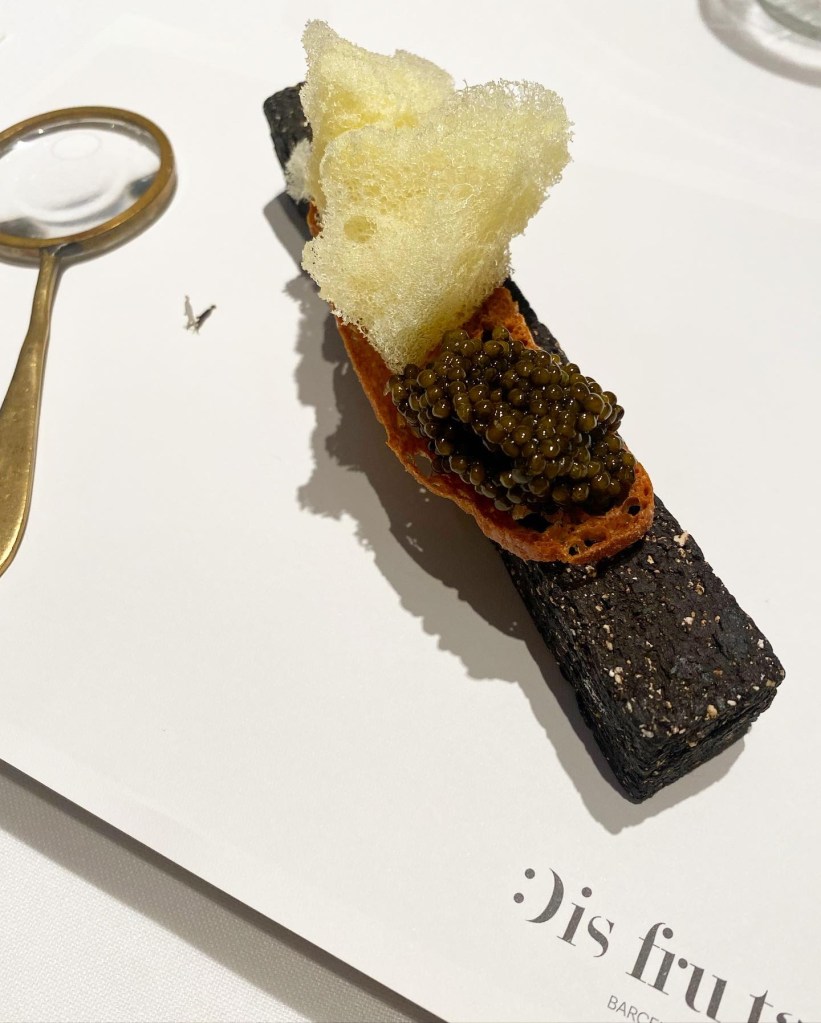 Acaban en grande con la manzana negra que consiguen llevándola desde que está fresca a la caramelización natural, a través del vacío y del armario caliente, en un proceso de más de dos meses y que la convierte en una auténtica golosina. Se acompaña espléndidamente con chantilly de vainilla, mantequilla noisette y un maravilloso hojaldre que consiguen también sin harina. Tal como lo cuento parece que aquí acaba todo y así es normalmente porque las mignardises cumplen siempre, pero en Disfrutar son tan deliciosas y bien presentadas que no caben en una foto.
