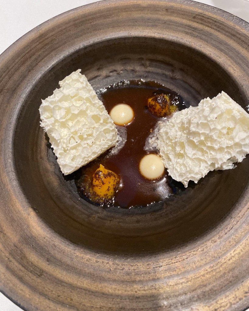 Para el caviar han inventado un vodka con trufa (macerada 6/7 meses en el licor), rabiosamente alcohólico y aromático, que sirven con su nuevo plato estrella de pan chino caliente (sin fermentar) con caviar y crema agria, los cuales dan frescor a un juego de temperaturas y de sólido y líquido, que parece imposible, casi tanto como las burbujas sólidas de mantequilla ahumada que acompañan a un canapé de caviar. Tan sorprendentes que las ponen con una lupa para que se vean mejor. Y se hacen con la máquina que crea las burbujas de las peceras