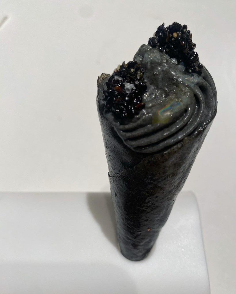 El pepino Hoisin tiene sésamo garrapiñado, sorprendente corteza de cerdo (sí, queda bien) granizado de jengibre y sorbete de pepino. Es impresionantemente fresco y prepara muy bien para la intensidad tostada y algo ahumada del cucurucho de sésamo negro que esconde yogur helado, sésamo y fresitas del bosque.