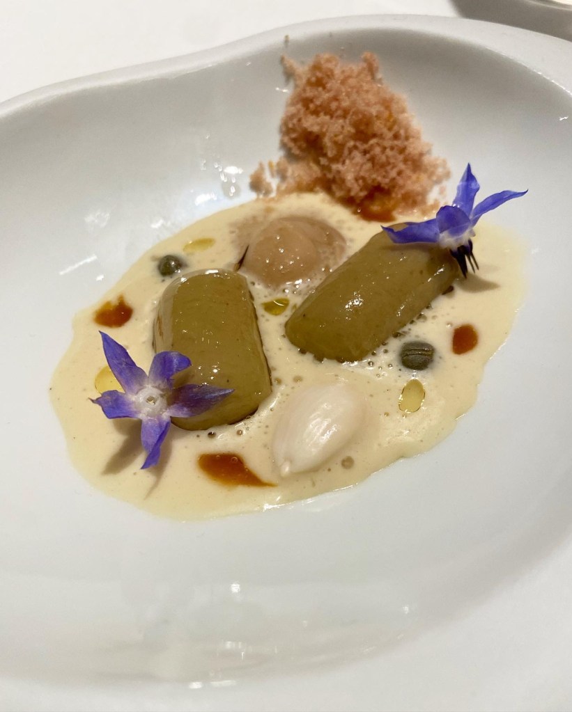 El mismo amor vegetal reluce en su delicada receta de calamares. Allí reinan los boletus -que se convierten en sabayon de mantequilla de “porcini”– y se perfuman con hinojo. Siempre lo digo,, pero como me encanta el hinojo aplaudo lo mucho que lo usan los franceses.
