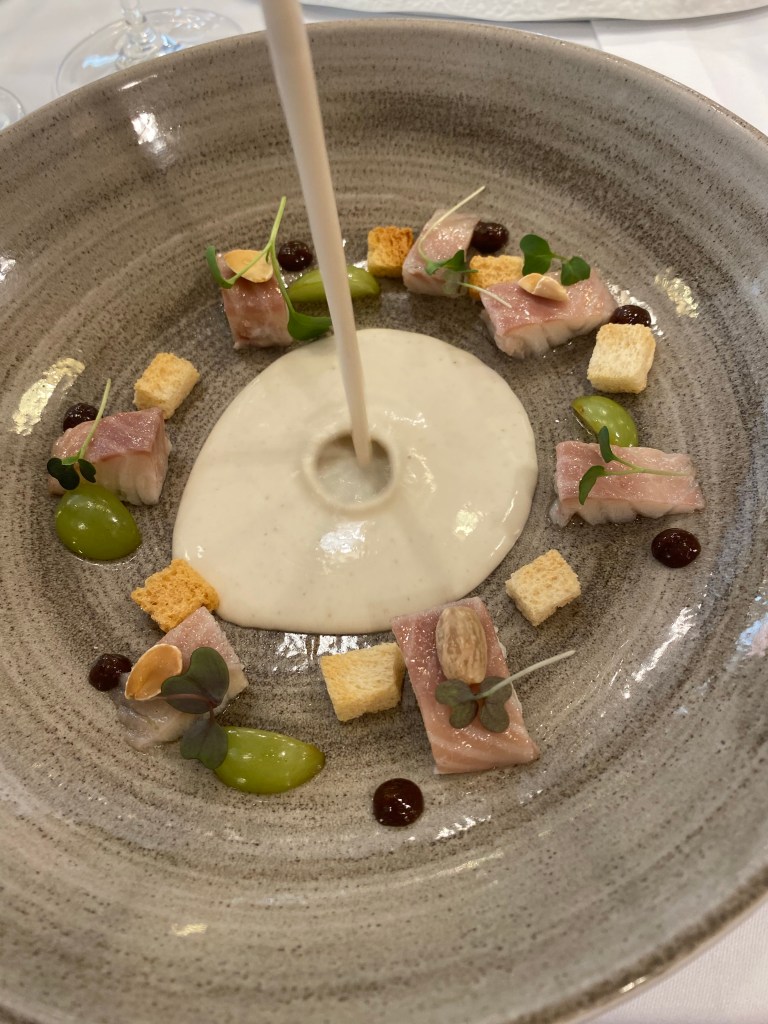 El ajoblanco con uva osmotizada y anguila ahumada es un bonito y suculento plato en el que resalta la uva, le sobra el pan tostado y la crema es una versión muy personal de poco ajo y notable densidad.