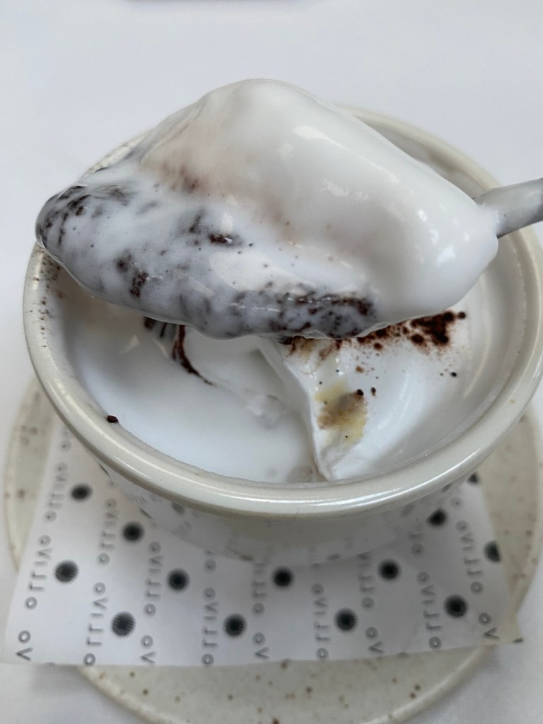 La leche de oveja es más convencional pero no decae: flan líquido (o sea, natillas), almendra garrapiñada, azúcar extraído de la propia leche y escarcha de yogur y vainilla. Muy refrescante y con puntos dulces y ácidos bien equilibrados.
