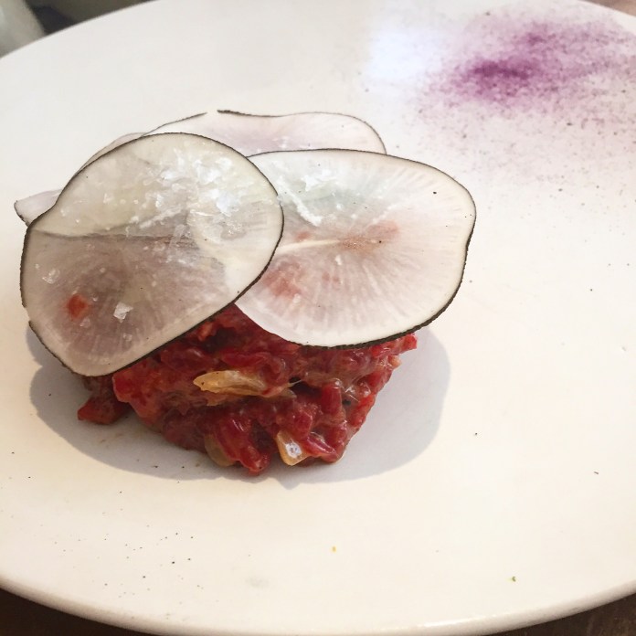 Me quedé con ganas de probar los mejillones al curry rojo o las vainas con vieiras (me gusta ese nombre tan simétrico) pero no se podían desdeñar los platos fuertes. El steak tartar, coronado de rábano negro y servido con tostadas de pan de cereales, está cortado a mano y aliñado con elegancia, quizá demasiada, porque resulta en el exceso suave. No estaría mal darlo a probar antes, como debe ser, para calcular el punto porque en esto de los picantes los gustos son multitud.