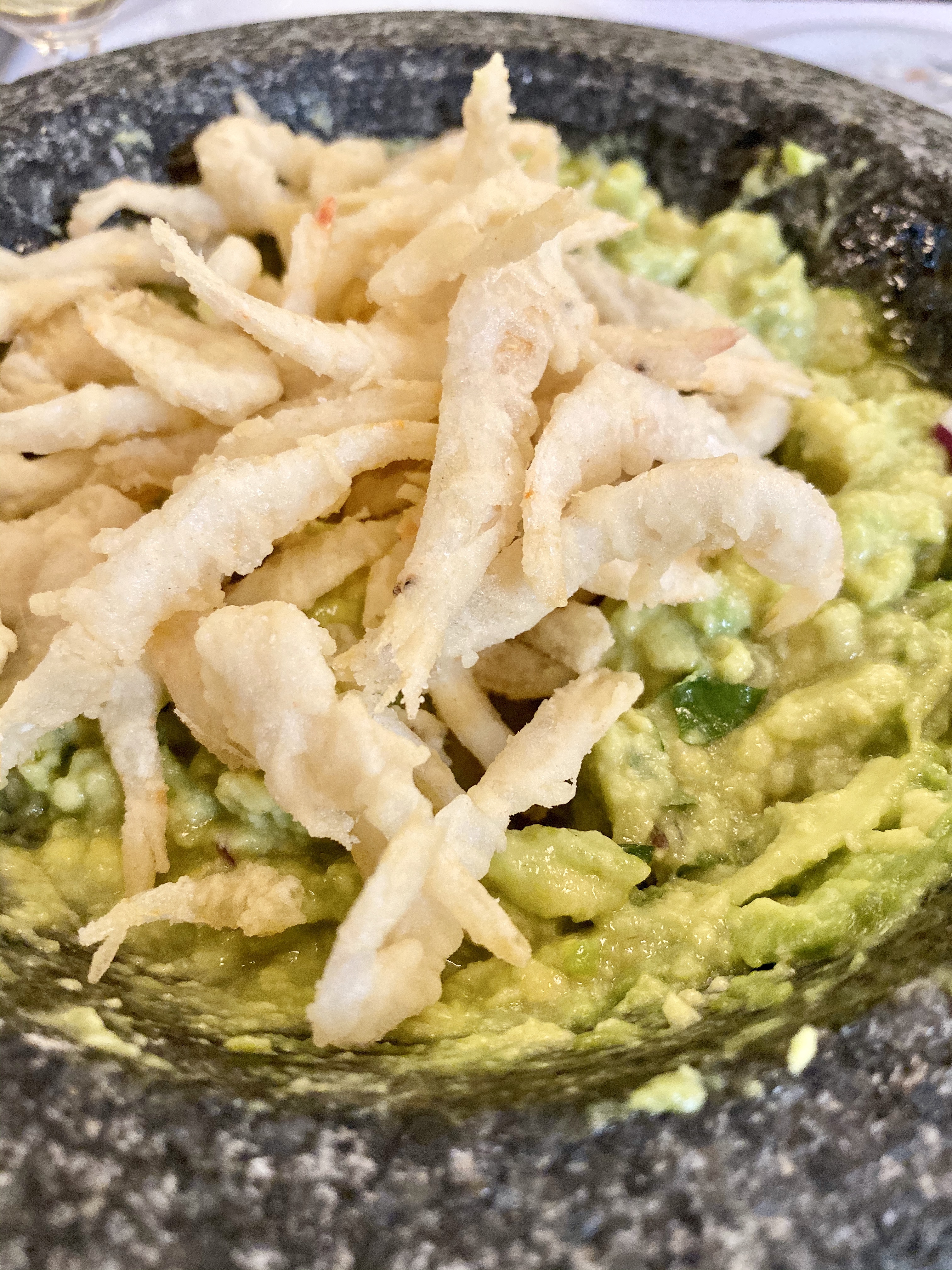 No probamos los arroces -de los que me hablan muy bien- para poder contarles más cosas y empezamos con el guacamole con gamba frita de cristal, ya saben esos camaroncitosfritos que crujen como tal. Se prepara ante el comensal y es un plato agradable y diferente gracias al crujiente que aportan las gambas. No demasiado sabor pero sí una buena textura.