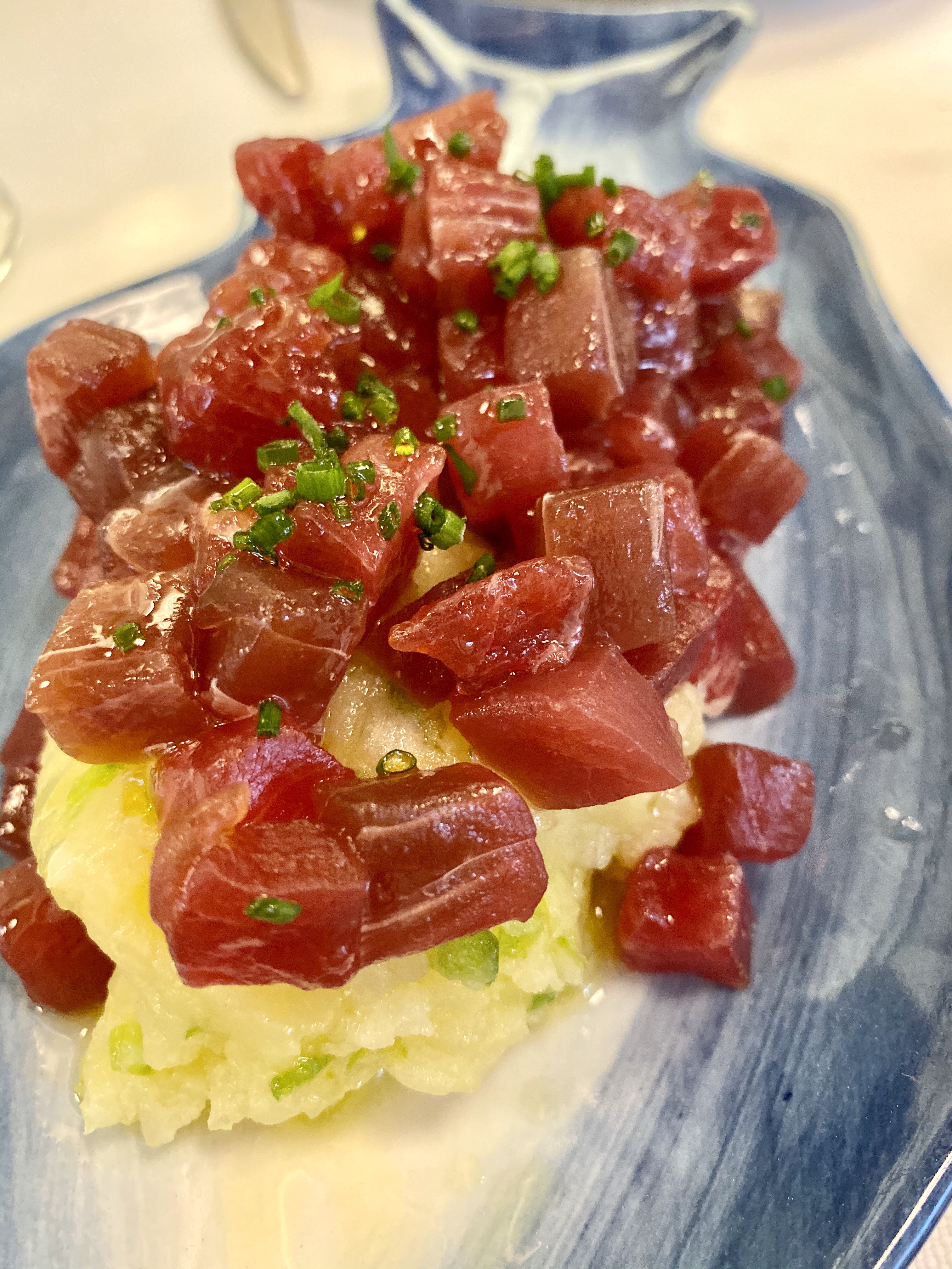 También muy buena la patata aliñada con tartar de atún porque todas las calidades son estupendas y las patatas (casi reducidas a puré) están muy sabiamente aliñadas y son un complemento perfecto a la fortaleza del atún crudo.