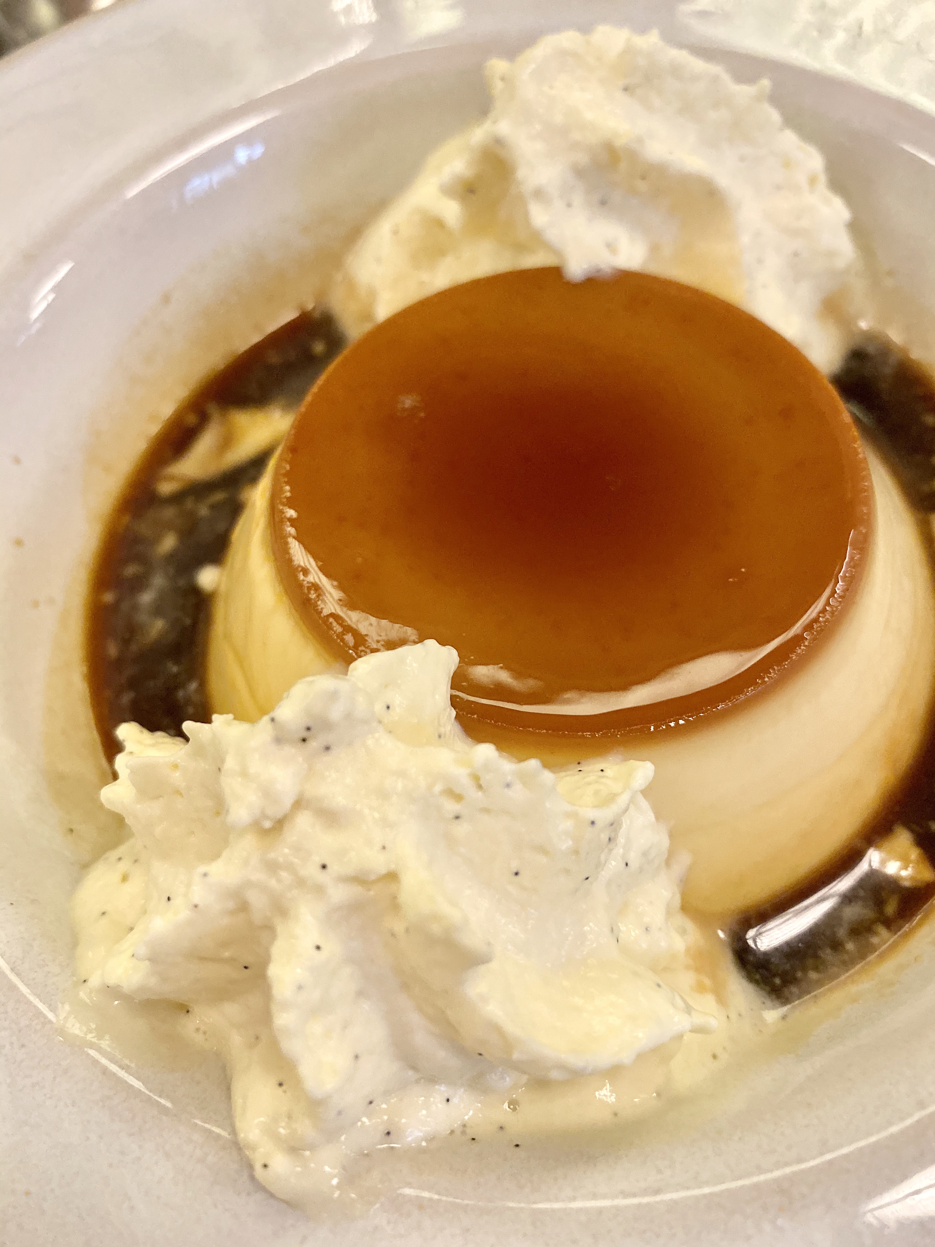 El flan, -cremoso como se lleva ahora- no está mal pero se queda corto y a caballo entre los de leche de toda la vida y los de crema, que deben ser mucho más untuosos. El ochentero acompañamiento de la nata montada tampoco ayuda demasiado.