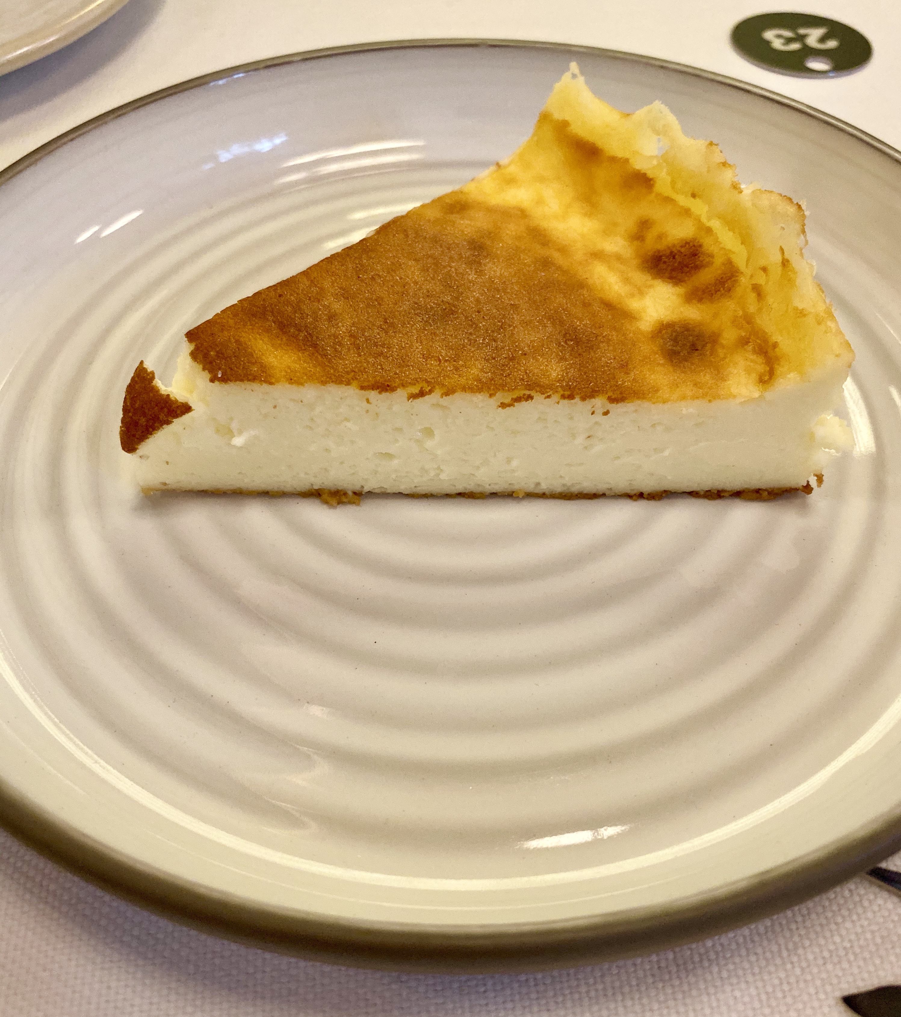 Los postres no se descuidan. Para empezar, unos estupendos cormetitos de limón y albahaca perfectos para limpiar el paladar. La tarta cremosa de queso al horno es muy exitosa pero no es lo que más me gusta, porque yo soy muy quesero y las necesito menos dulces y con quesos más fuertes. Acertadamente pone la mermelada aparte. El flan es tan untuoso que lo llama cremoso de huevo y chantilly (este es el perfecto acompañamiento).