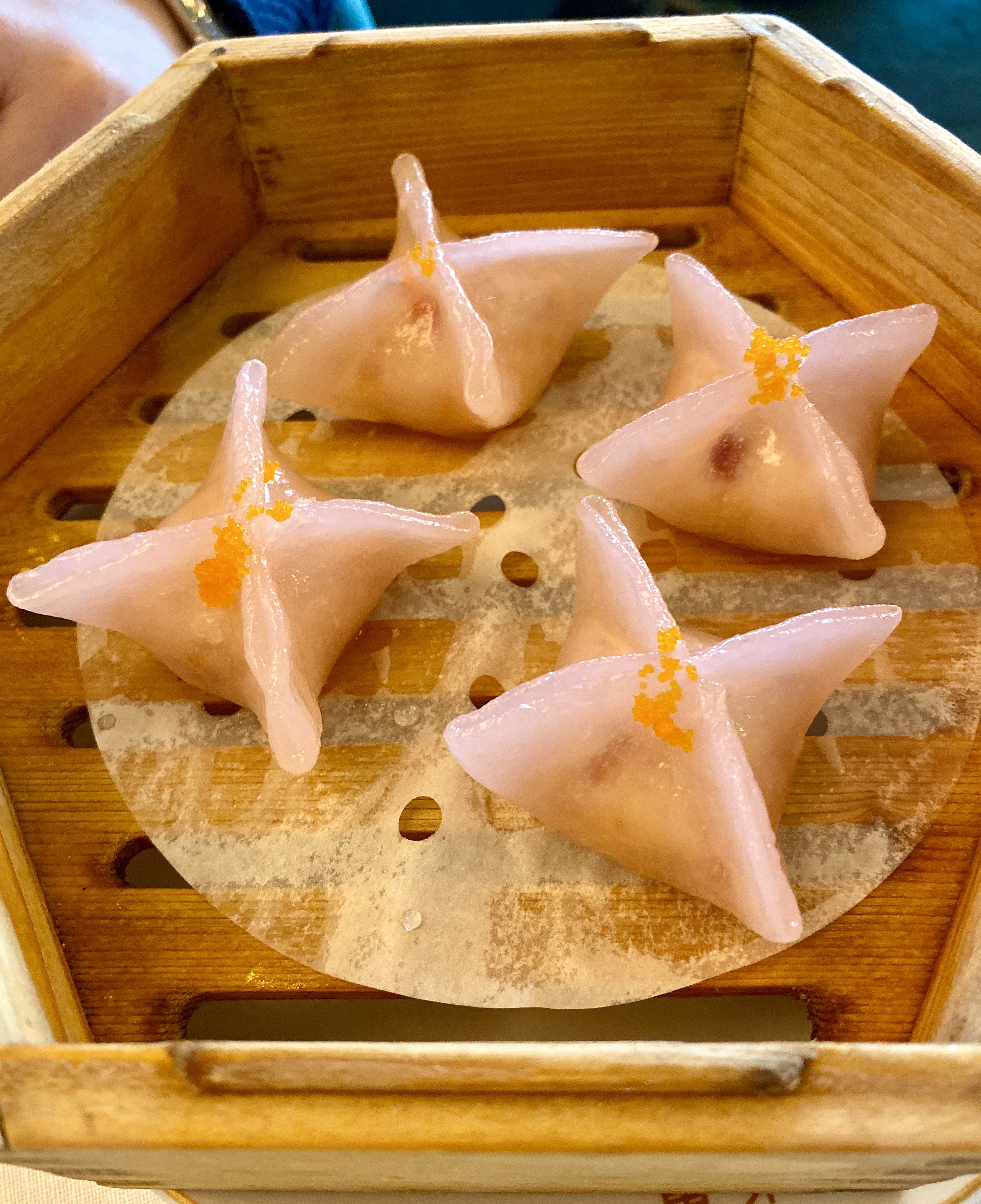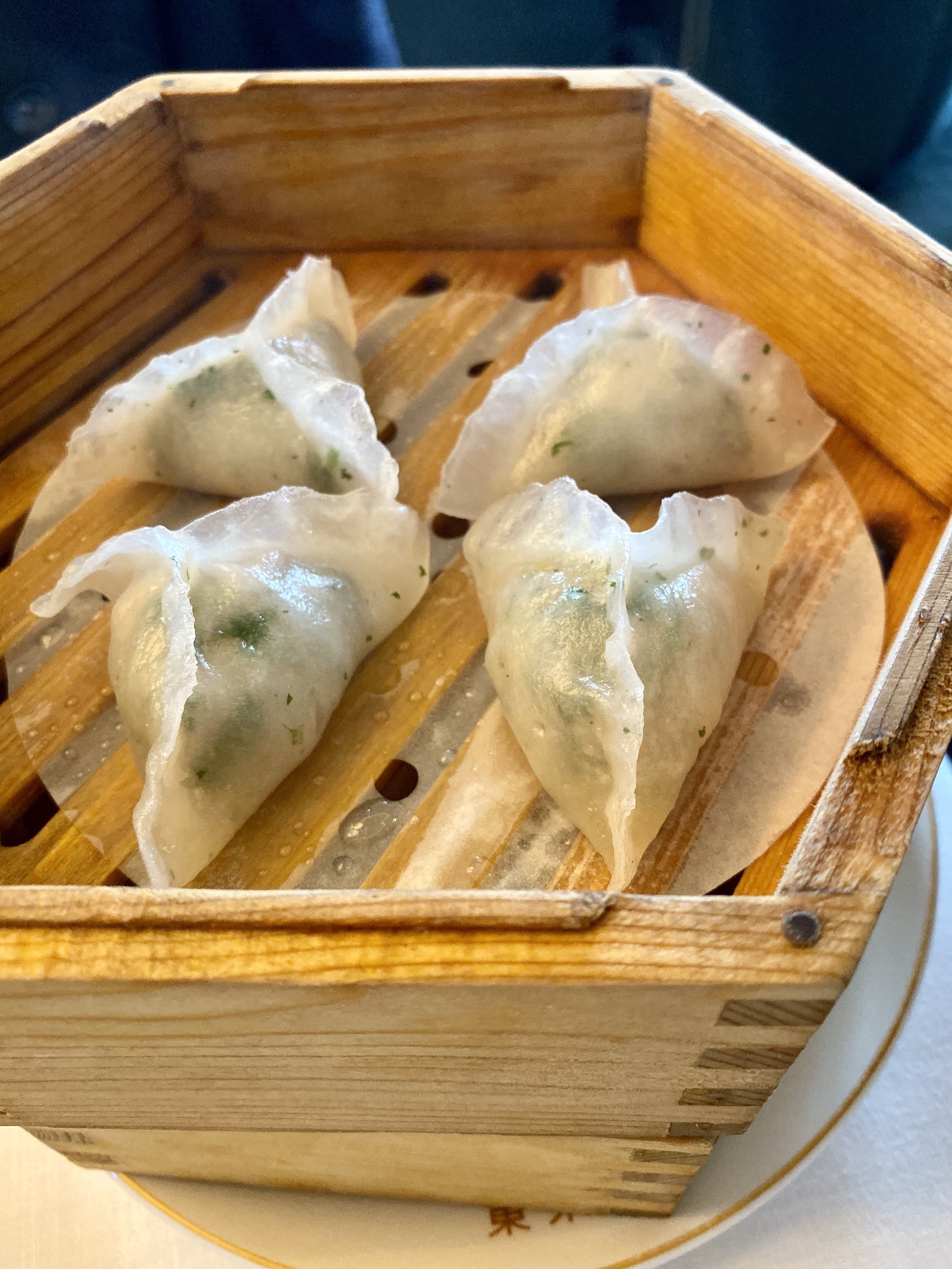 Don Lay es famoso por los dim sum; por eso, y porque me encantan, había que empezar por ahí. Por el hakao dim sum (de pasta transparente): primero los de boletus con carne de cerdo, cilantro y castañas de agua. La masa es muy leve y trasluce un interior que es suculento y muy sabroso. Felizmente el cilantro no mata los sabores y el boletus resalta convenientemente (aunque no creo que los haya en China…)