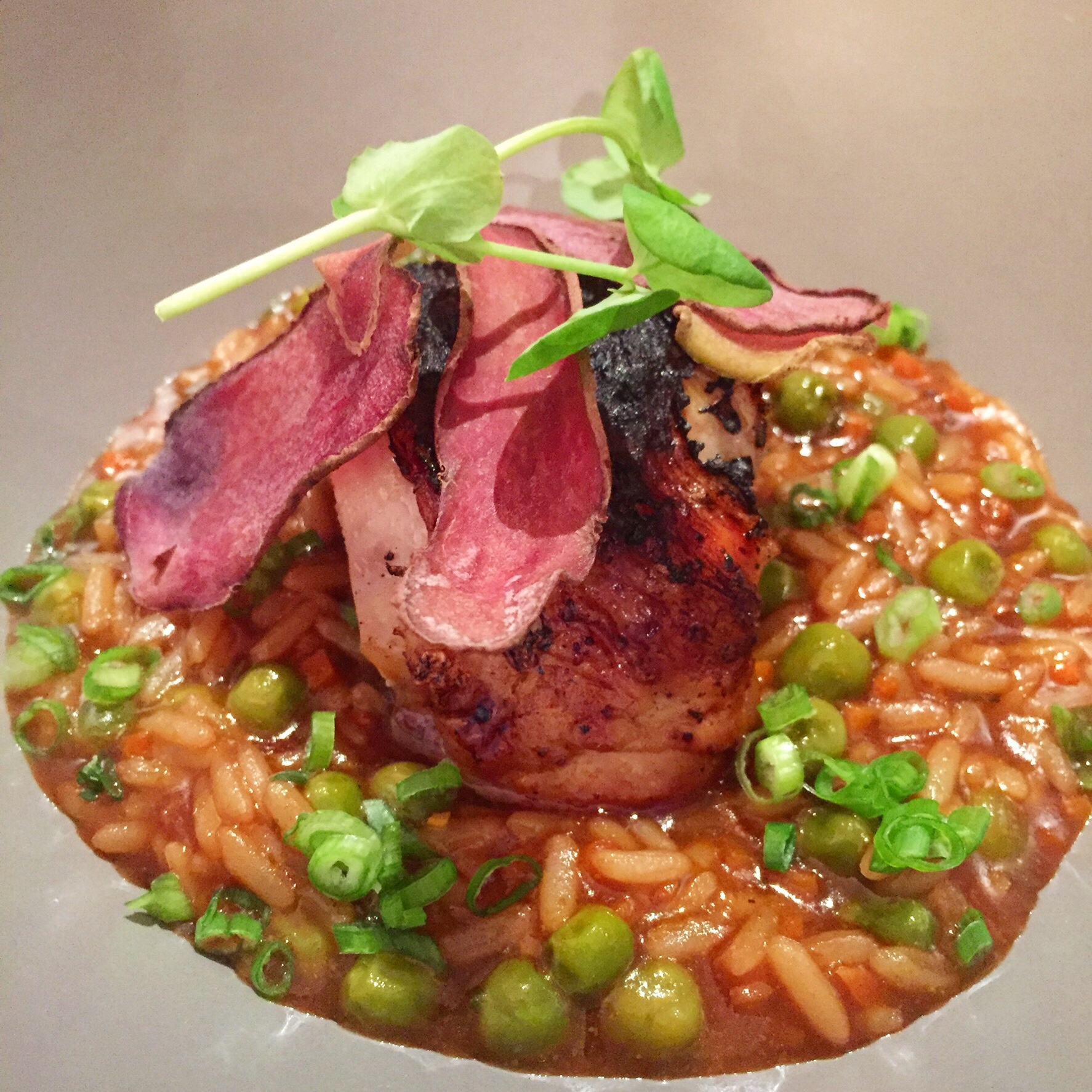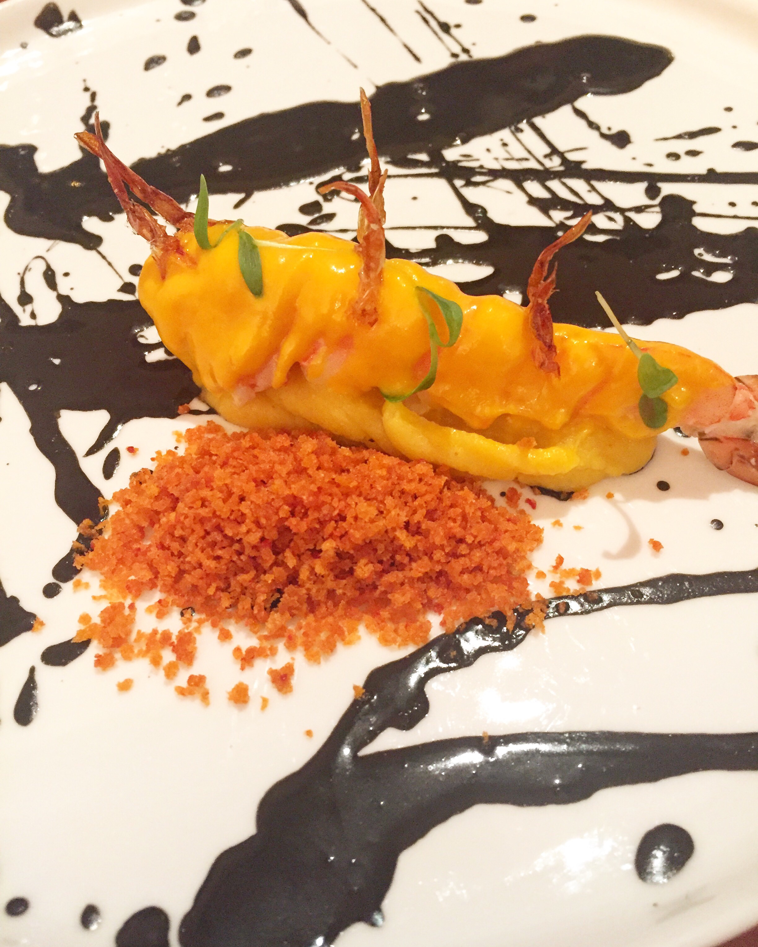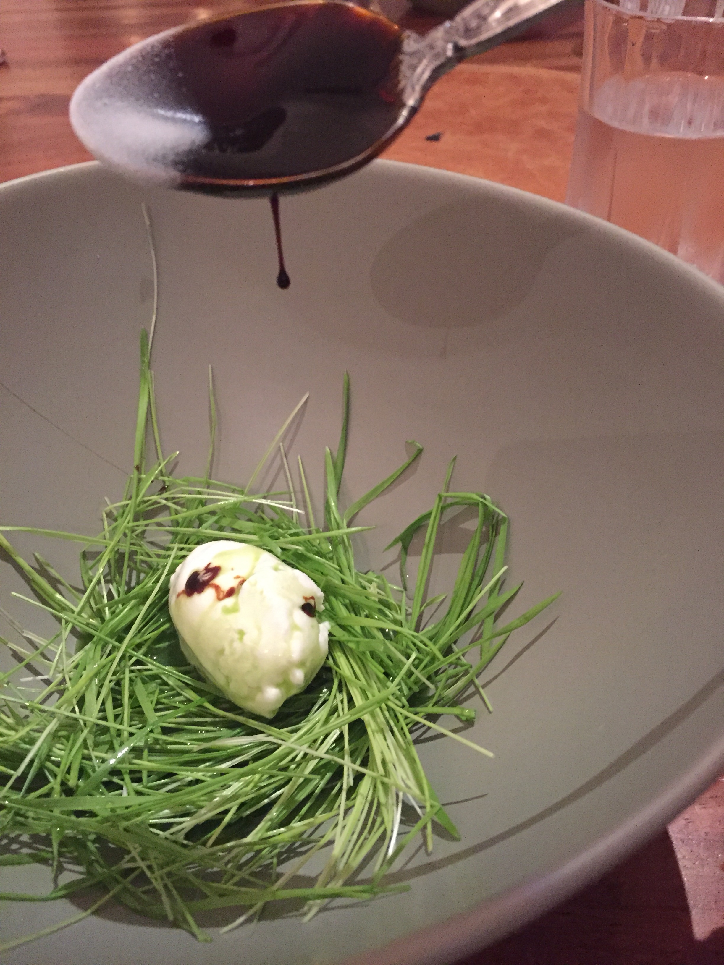 “El binomio de guisantes con bacalao” (vaya pareja) es extracto de técnica e imaginación: delicados guisantes del Maresme guisados con callos de bacalao y una especie de perfecta tortillita líquida de brandada con holandesa de menta, coronada por caviar y circundada de espardeñas fritas a la andaluza. De las mejores que he probado. Qué buenos son los viajes. Y el mestizaje… Un plato complejo, delicioso y perfecto.