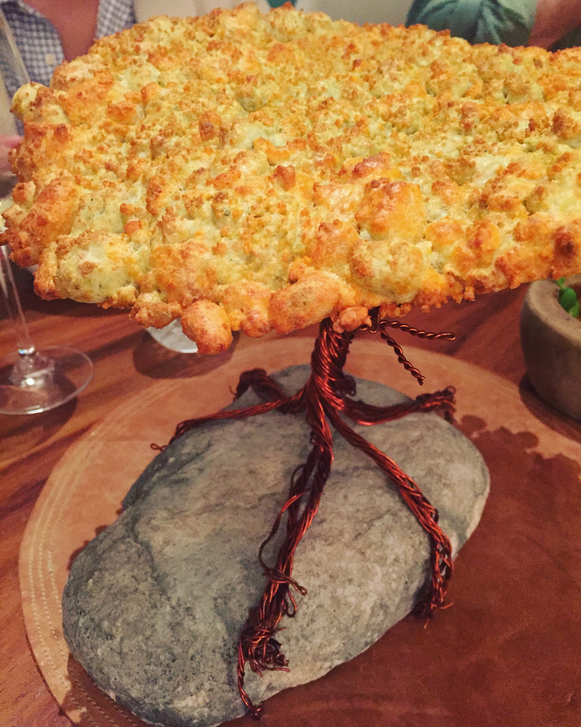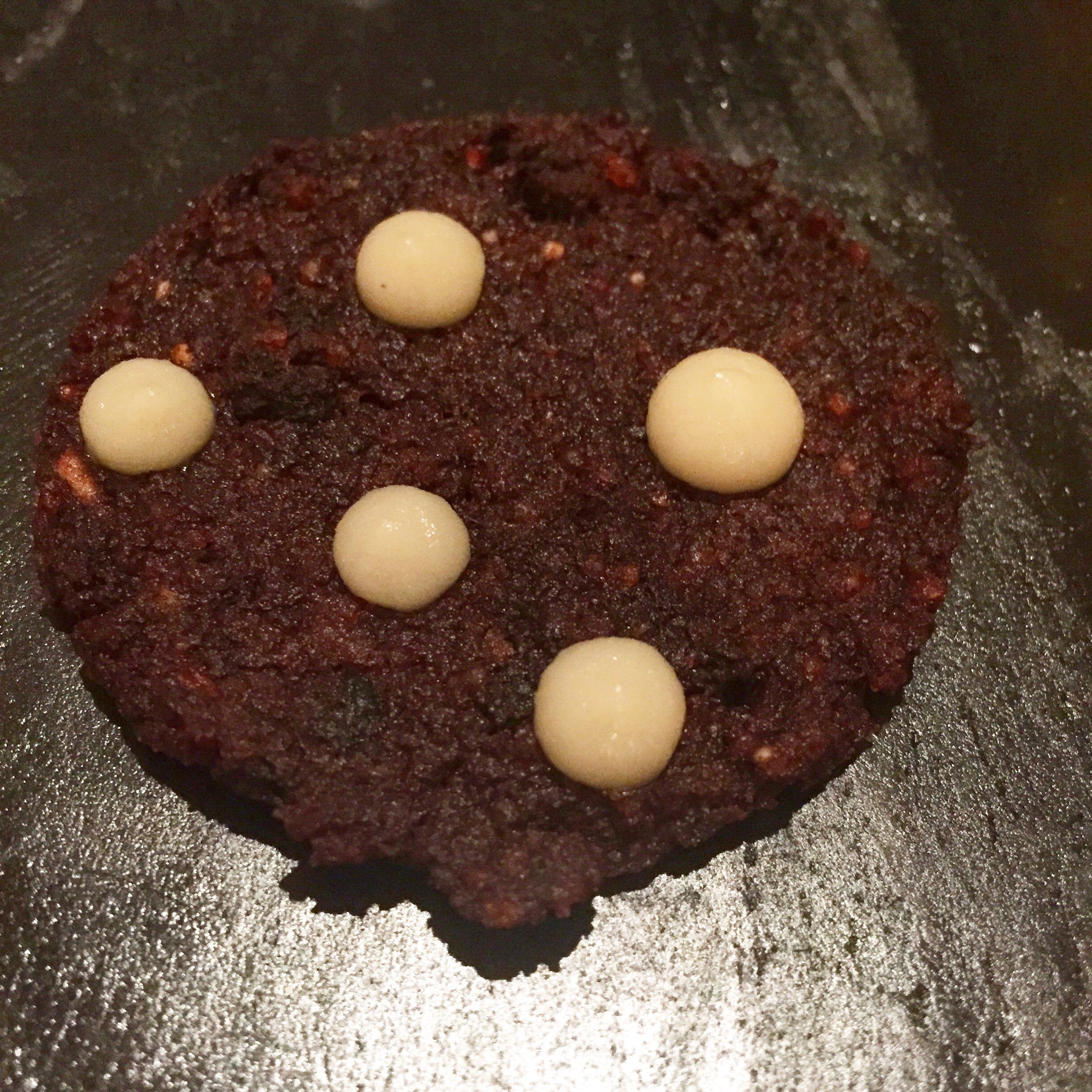 Para acabar, la caza, y en su plato principal, otra obra maestra de la presentación: un soberbio lomo de gamo a la royale con madroños que parece un mosaico y se acompaña (aparte) de cosas impresionantes: un sabroso pincho moruno de pato azulón que parece Marruecos en pato, un parfait de sus interiores con castañas, trufa y Comté (una especie de galleta com esos cuatro sabores muy marcados y combinando a la perfección) y, para endulzar, un bonito y original cruasán de boniato.