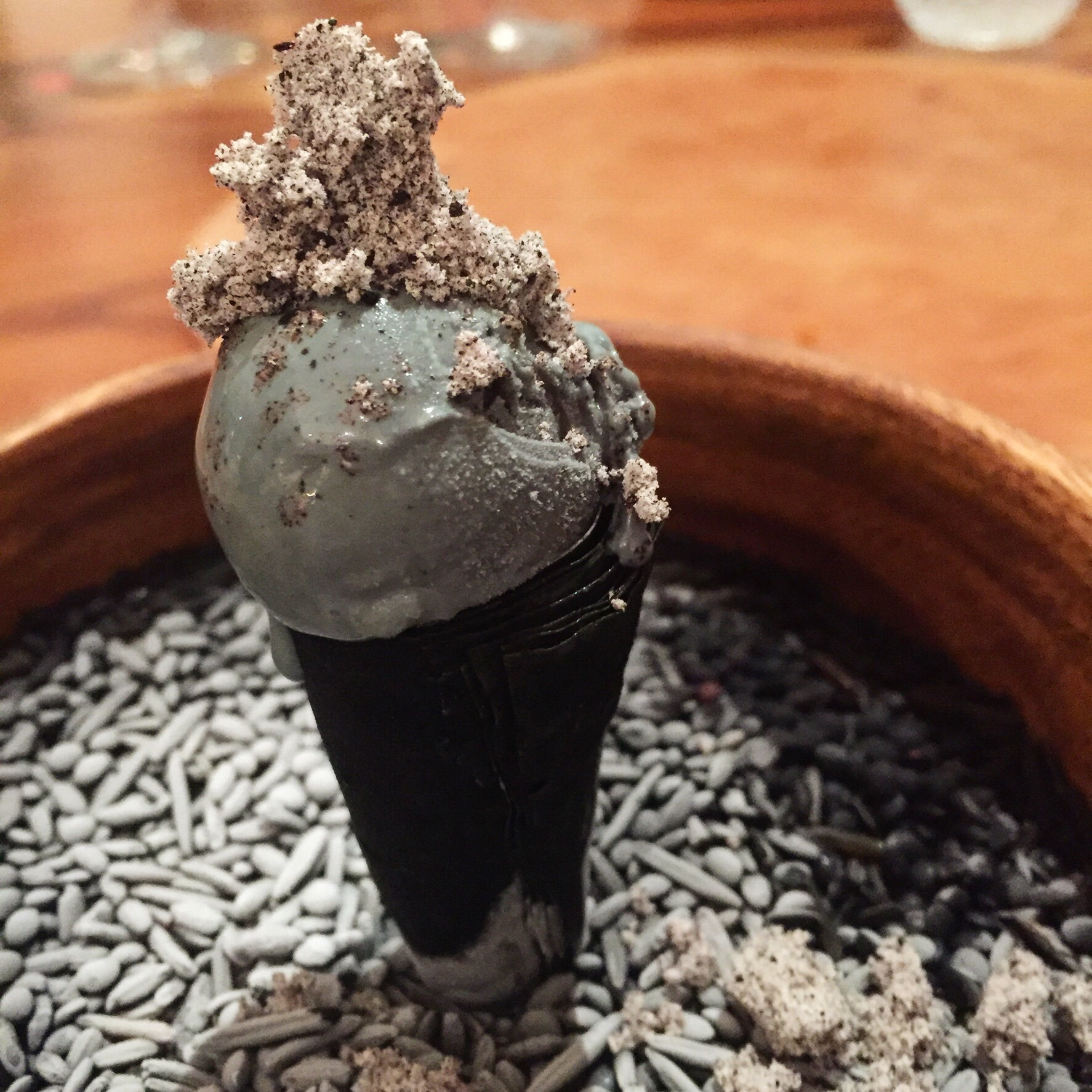 Después, una bonita e irresistible copa -que recuerda a aquellas de helado de las grandes cafeterías ochenteras, pero en mucho más elegante- de ciruelas al whisky, caramelo café, babá al Lagavulin y merengue de regaliz con una mezcla de sabores dulces de repostería y ahumados y alcohólicos de buen whisky, absolutamente espectacular. Todo está muy bueno pero el babá podría ir perfectamente solo porque es perfecto.