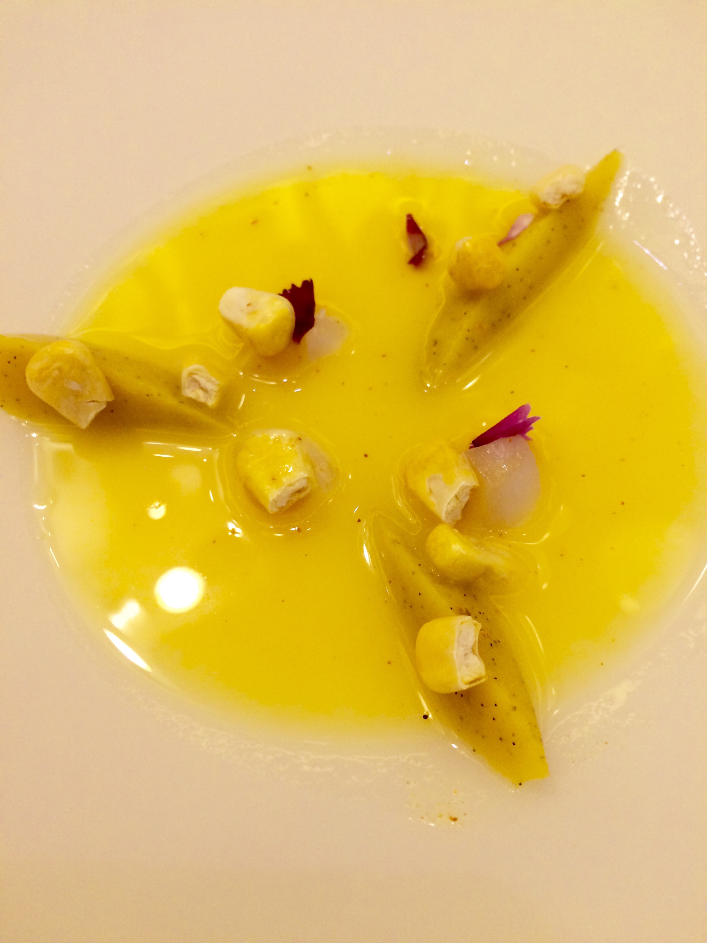 En un alarde de sensatez, acaban aquí sorpresas y trampantojos (quizá no estamos preparados para más) y se sigue con un delicioso consomé de caldo transparente y semisólido -conseguido tras muchas horas de cocción y ningún hervor- y microscópicas verduras que forman un hermoso y multicolor collage. Sigue la sopa de pistacho, melón, pepino, queso de cabra y granada, una mezcla refrescante sumamente potenciada por el queso y servida en un rico plato de oro.
