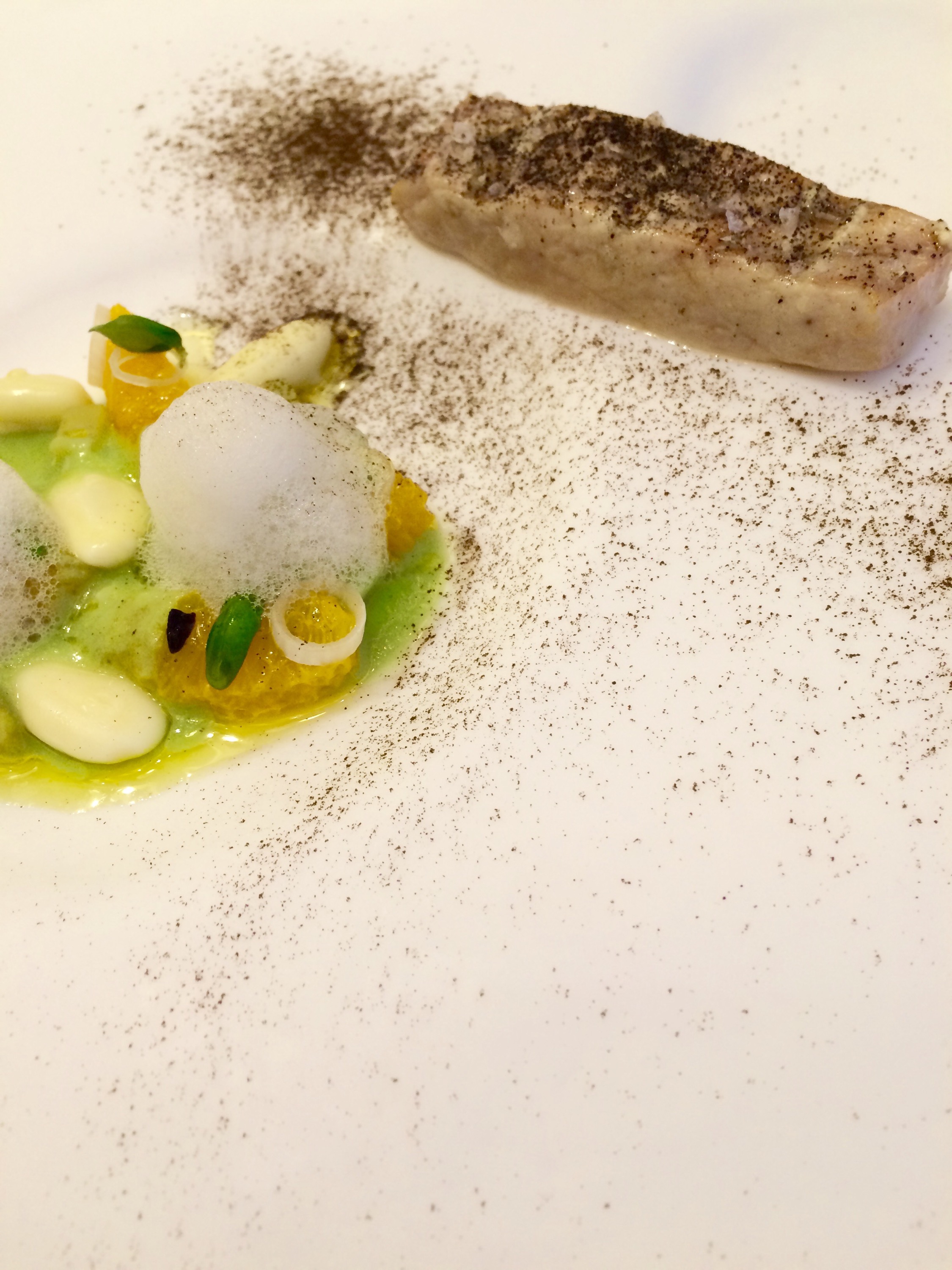 La sopa de lichis, gengibre y ají y la trufa con maíz tostado, huitlacoche y tomate confitado en soja y especias continúan con esta gran declinación sobre el maíz que mezcla con todo y con todo sobresale. El aroma de las trufas combina a la perfección con el huitlacoche y no tan bien con la fortaleza del tomate cuyo confitado es potente y aromático, pero demasiado contundente para la delicadeza de la trufa, aunque todo el plato es bello y delicioso.