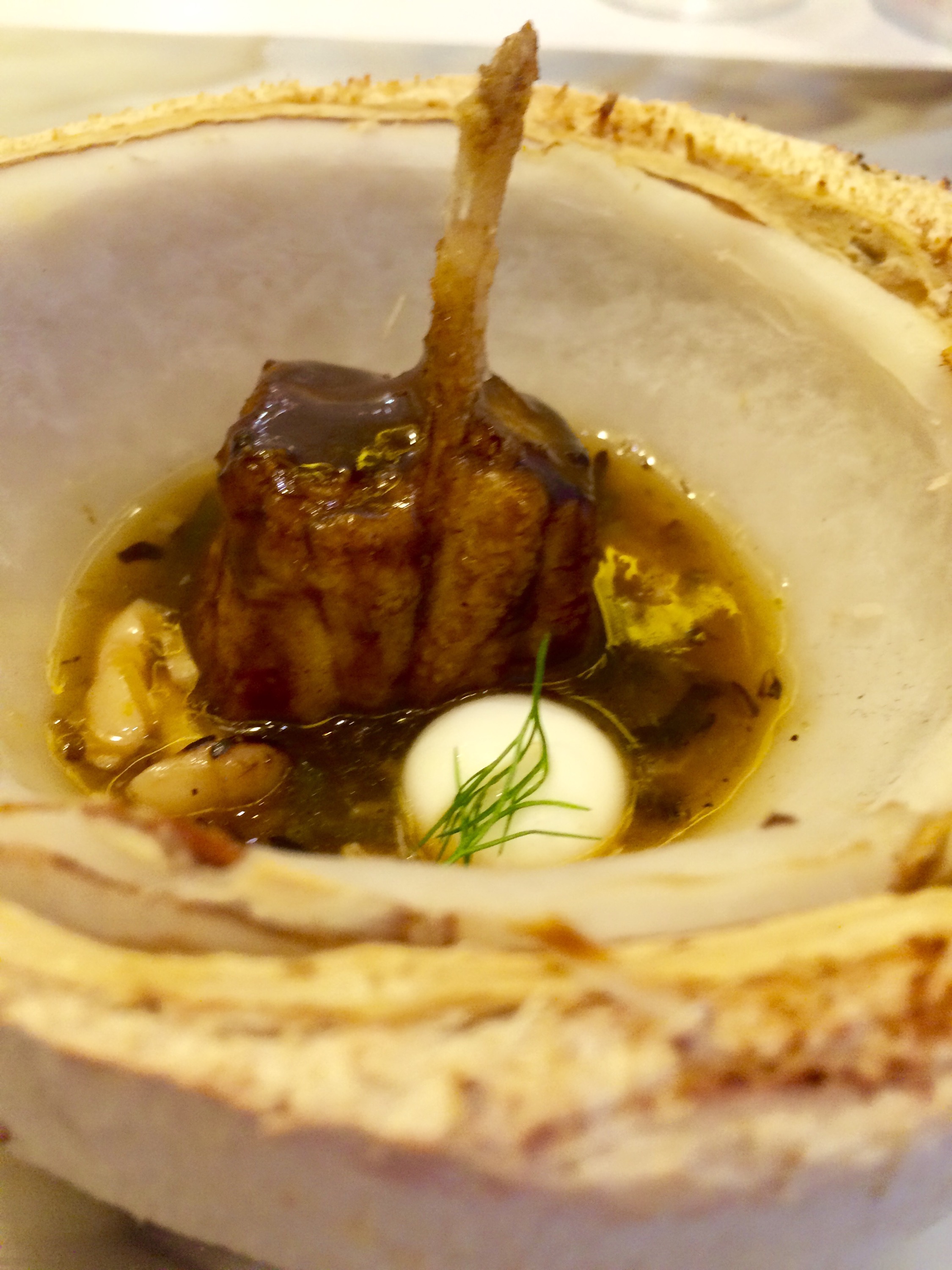 El coco verde con callos de bacalao, chuleta de raya y mozzarella es un ex libris de Muñoz. Cambia ingredientes pero siempre esta presente. Este completa a la perfección el plato anterior dando homogeneidad y coherencia a todo el conjunto.