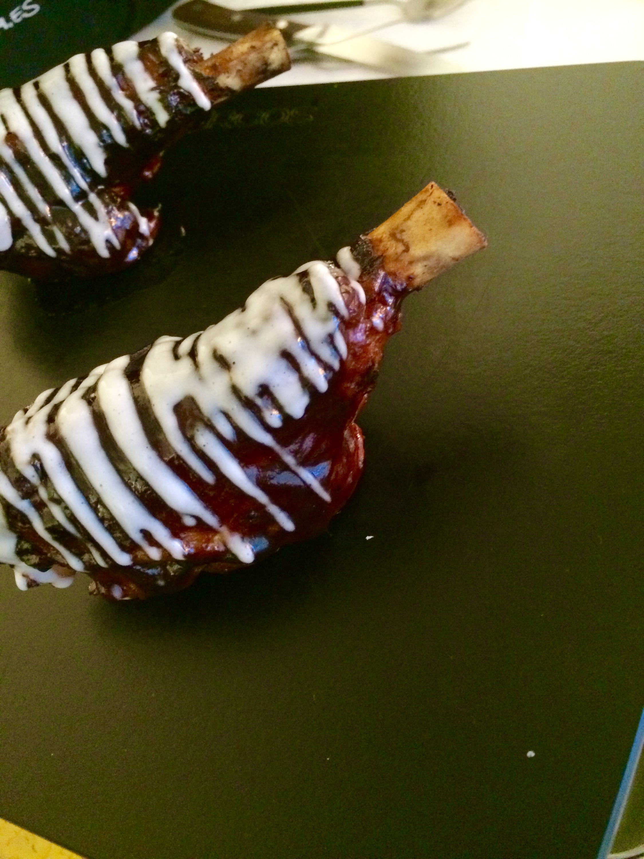 Lo de embriagar todos los sentidos se aprecia en el  finale salado. Como si de una sinfonía se tratase, la partitura va in crescendo. Se cierra una cortina en torno de la mesa, aparece un candelabro encendido, una copa de Burdeo, y un pequeño reproductor de música con canciones francesas de los 70. Es el regreso al pasado de la mano de Robuchon y en forma de pequeños y tiernísimos jarretes con una variedad tal de guarniciones que marean: bizcocho de mantequilla, bombón de Calvados, macarron de apionabo, guisantes a la menta, etc. Para que el guiño sea completo un fondo del más tradicional puré de patatas y una densa e inolvidable jugo de carne con anacardo, cacahuete, curry en polvo, albahaca, hierbabuena… Magnifico. Sorprendente.