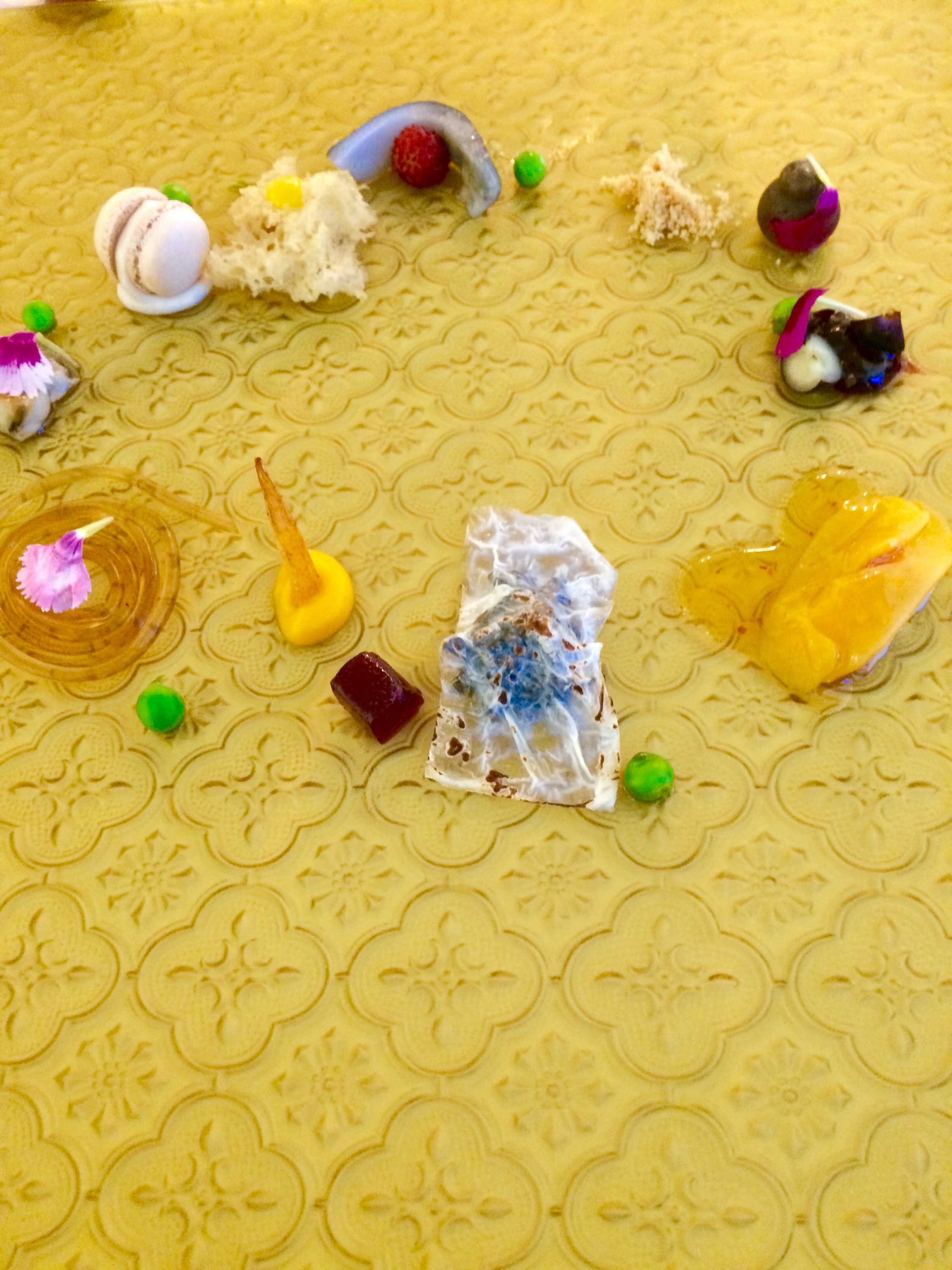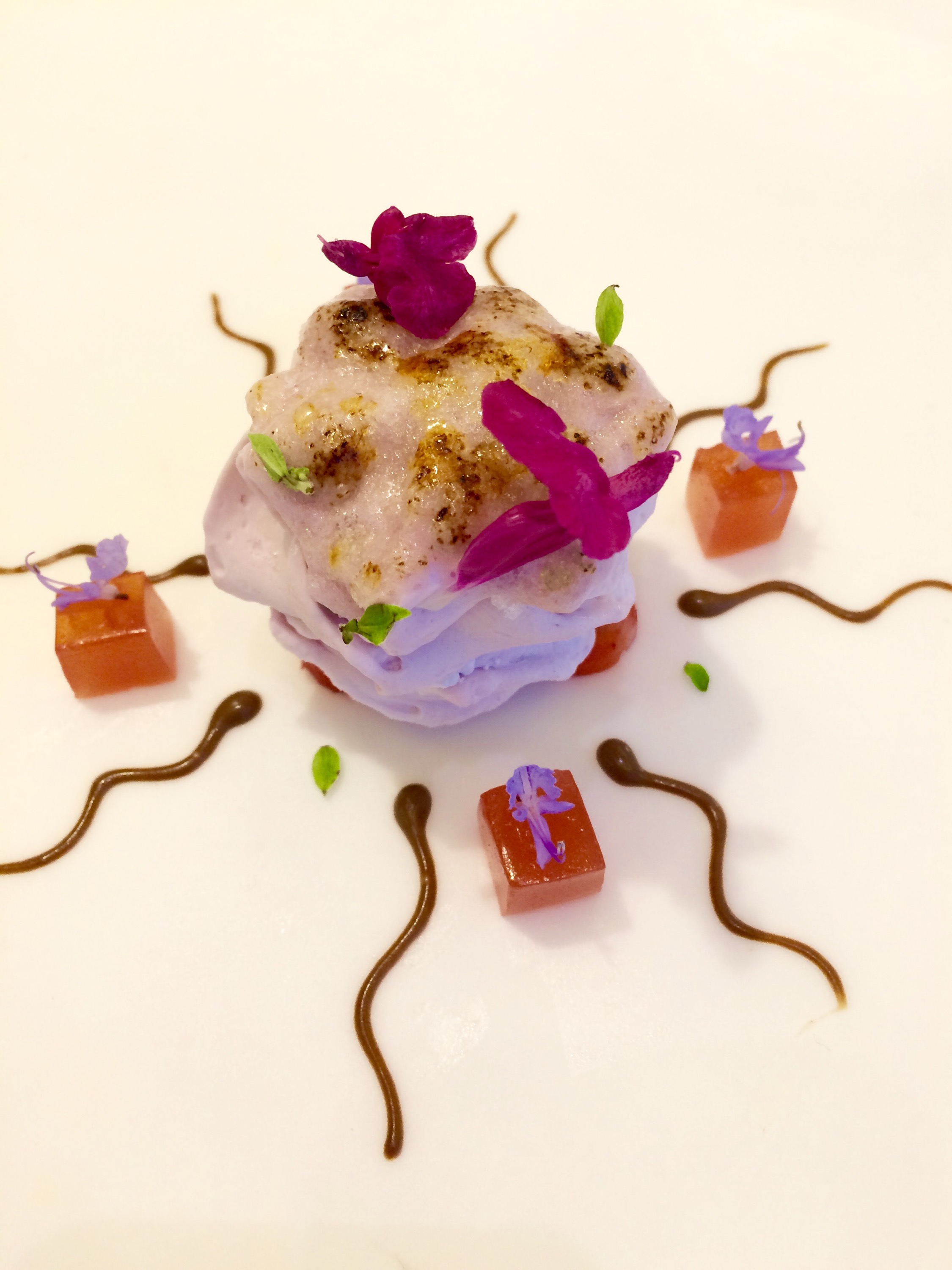 La capacidad de sorpresa parecía colmada pero faltaba un plato que me hace desdecirme de mi prejuicio sobre la flojedad de los postres de DiverXo. El pastel de violeta, ajo negro, guayaba y flores es una excelente receta y unos de los platos más bellos y coloridos que quepa imaginar.