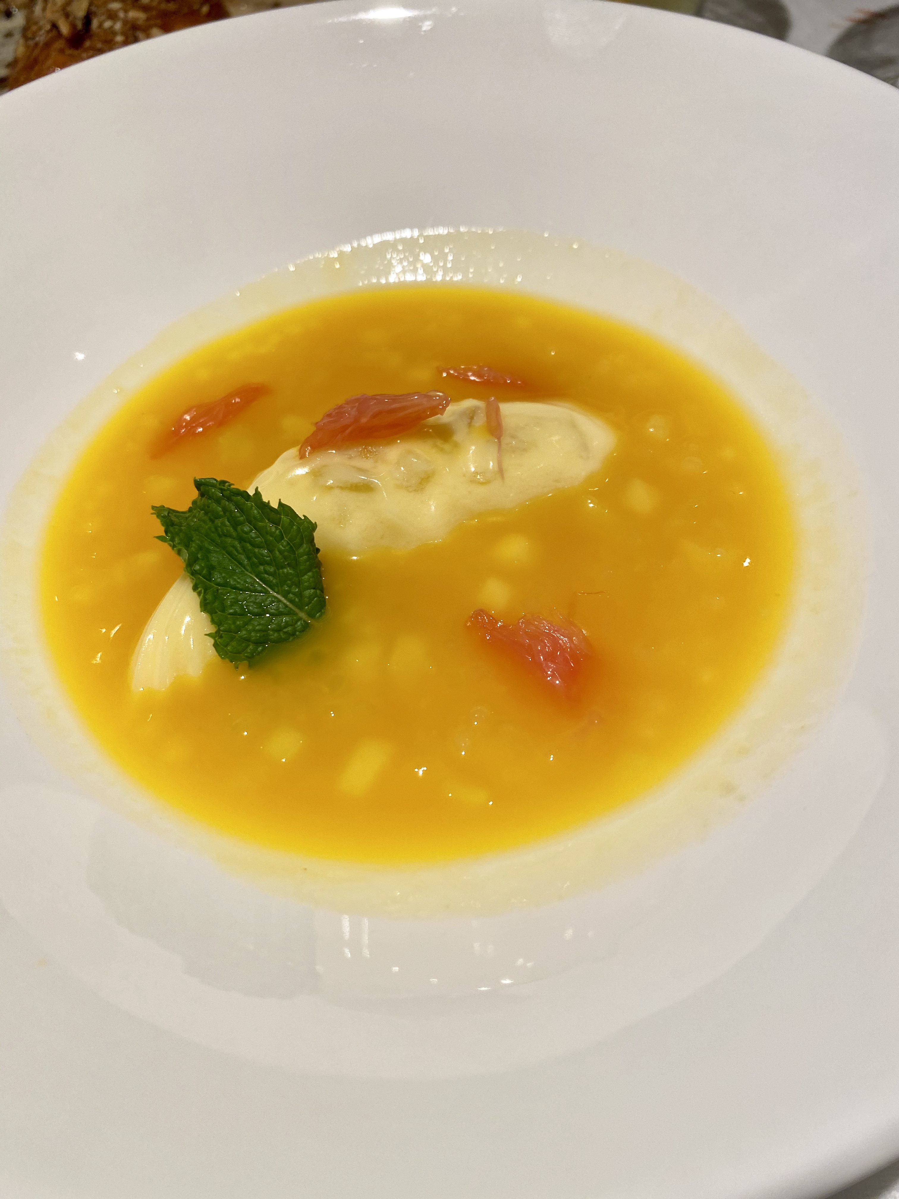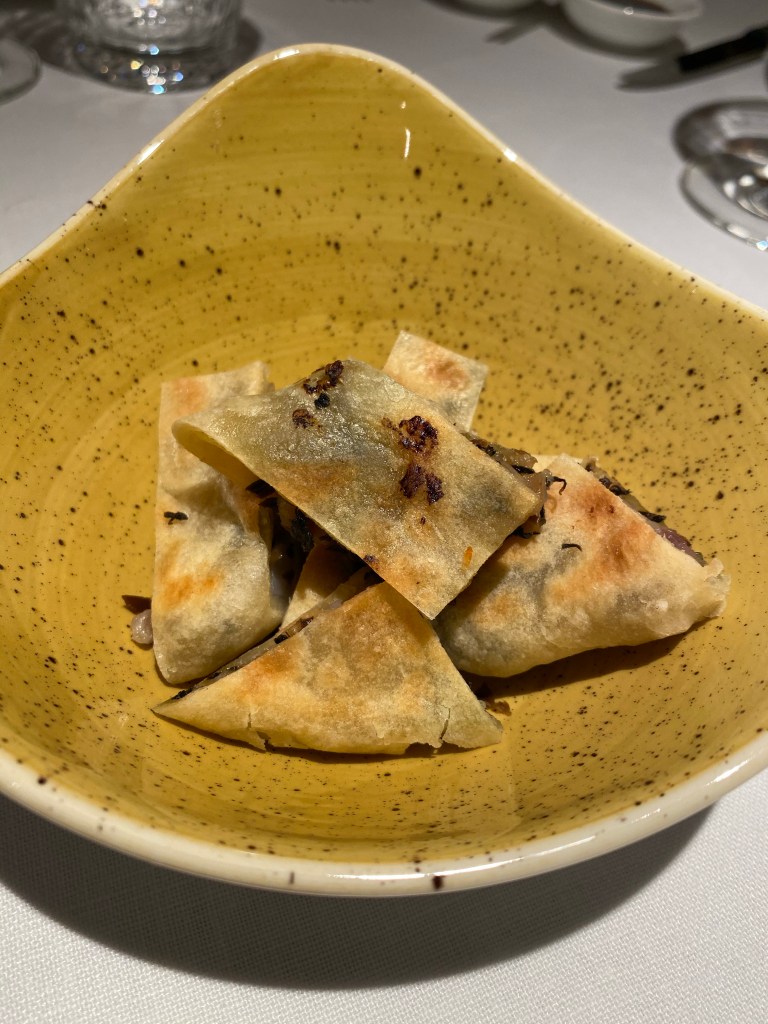La piel de ternera suflada me resultó algo áspera y seca, todo lo contrario que el magnífico guiso de rabo confitado, salsa de ostras y cilantro, un paseo entre Europa y Asia creativo, sabroso y juguetón.