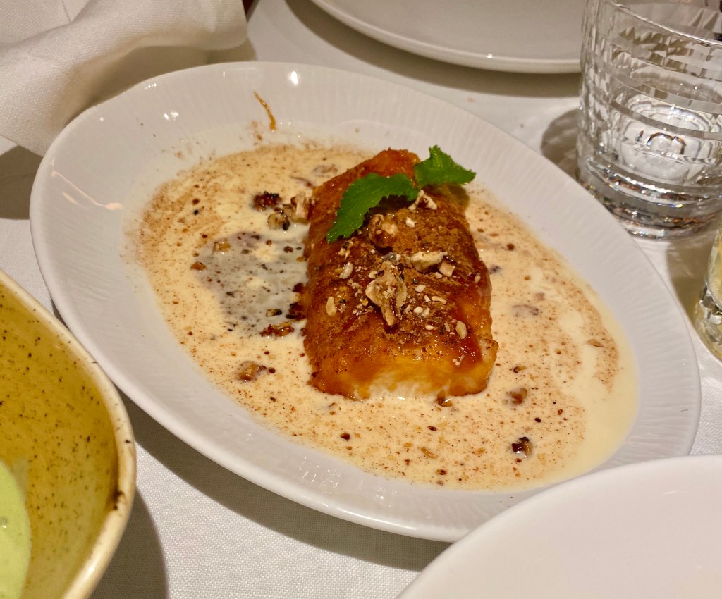 Los lomos de lenguado salvaje con ensalada marina y ajoblanco son agradables y bastante convencionales. El ajoblanco es tan bueno como el lenguado y la ensalada de algas. Gusta pero no emociona.