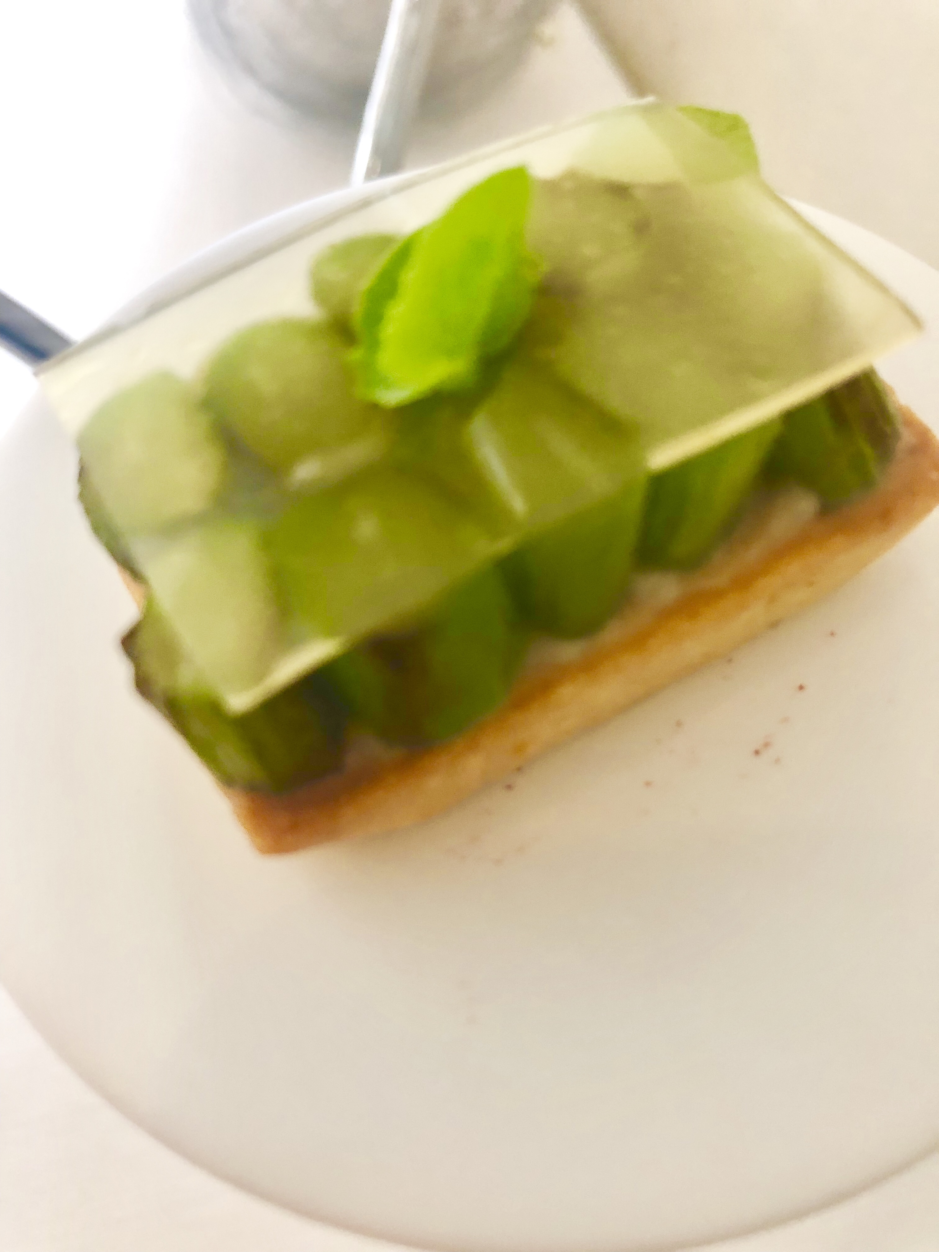 Fresh: pepino, manzana y cítricos. Nuestro flan de queso de Tou des til-lers con bacon, berenjena y espinacas. Perfecto postre para bajar platos bastante grasos y llenos de sabor. El granizado es perfecto y el flan en plato aparte, con sus toques de verduras, es sencillamente excelente.