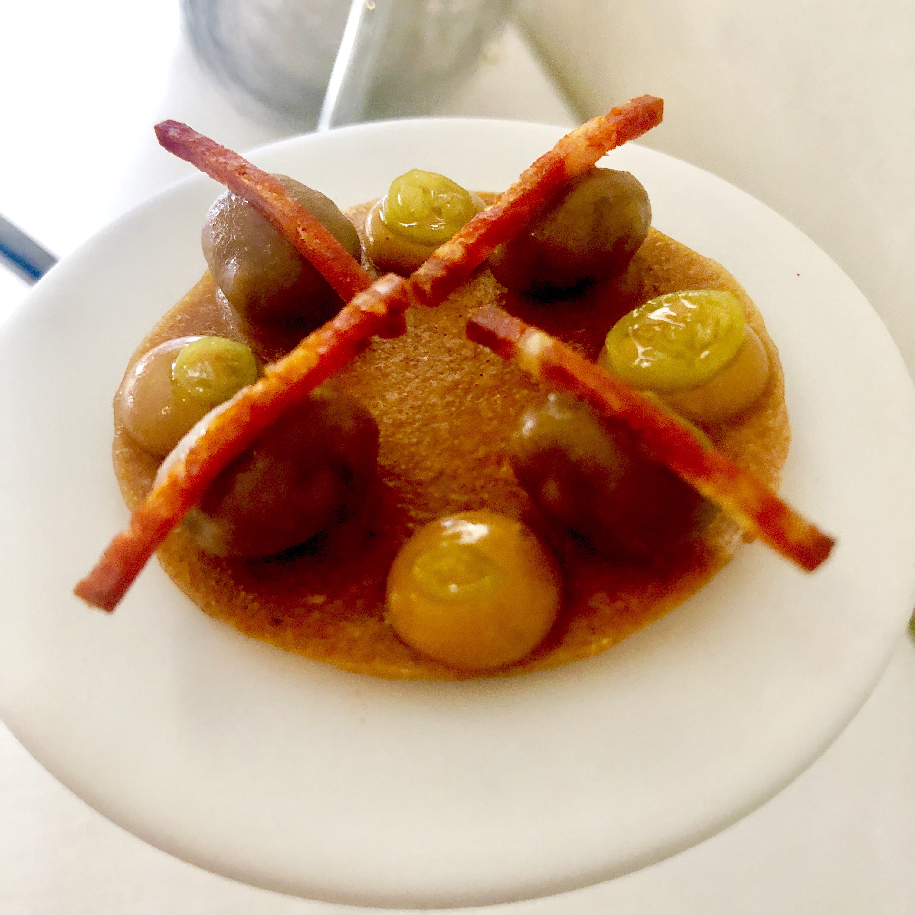 Los aperitivos son deliciosos y modernos: vermut con espuma de kumquat, intenso, especiado y delicioso; cornete de algas con mejillones en escabeche que, como es sabido, es el gran acompañamiento del vermut, incluso en su forma tradicional; una frágil tartaleta de setas, grasa de foie y trufa con polvo de boletus; y una espectacular y “muy real” bellota (que es un bombón de manteca de cacao) rellena de paté ibérico Joselito. Los cuatro impresionan por su mezcla de sabor tradicional envuelto en formatos muy diferentes.