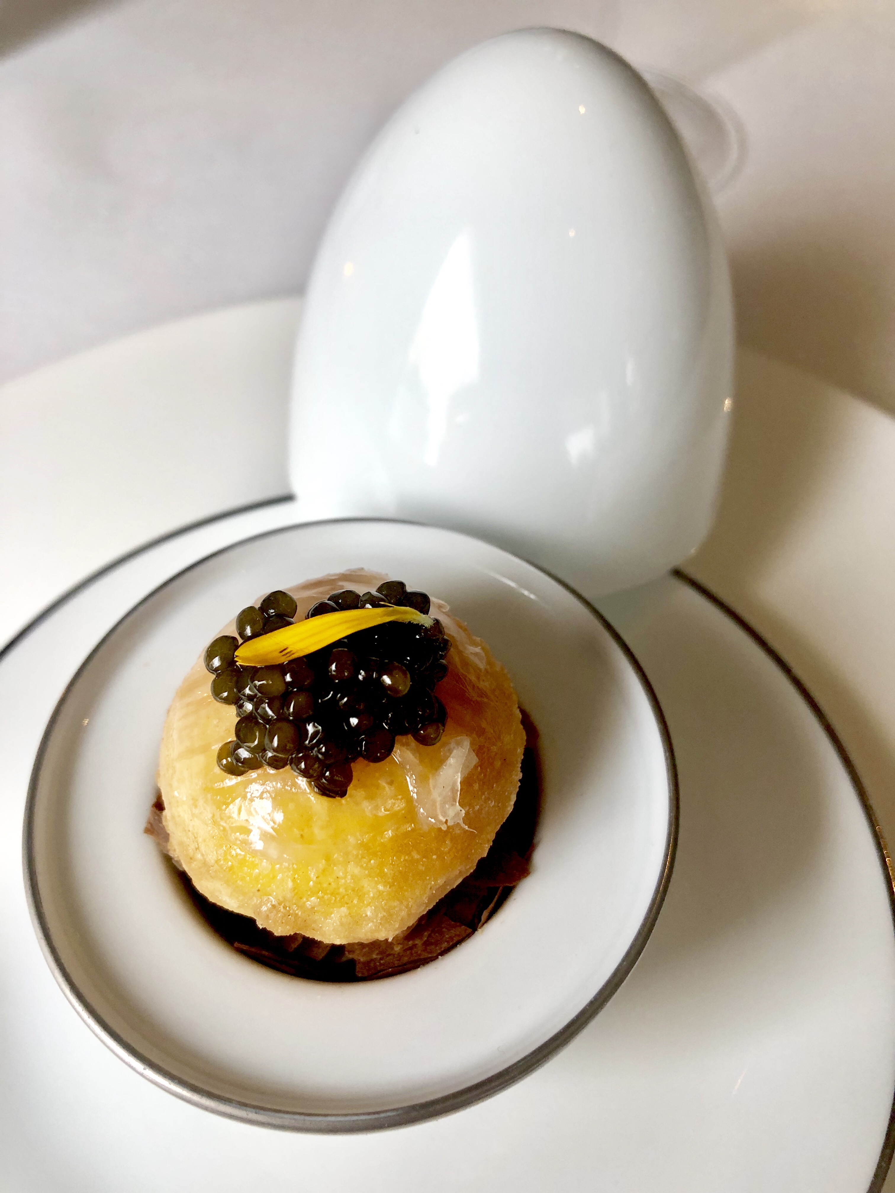 Reconozco que ya estaba muy bien predispuesto, pero fui totalmente ganado con un impecable huevo con caviar. La yema (sin duda curada) se esconde dentro de un tierno y brillante buñuelo. Y ese brillo se lo da una lonchita de lardo. Y otra vez la misma idea de antes de aumentar los sabores del ingrediente principal porque está muy bien potenciar la grasa y la salazón del caviar con las del tocino. La yema inunda la boca y se mezcla con todo lo demás envolviéndolo. Un bocado delicioso.
